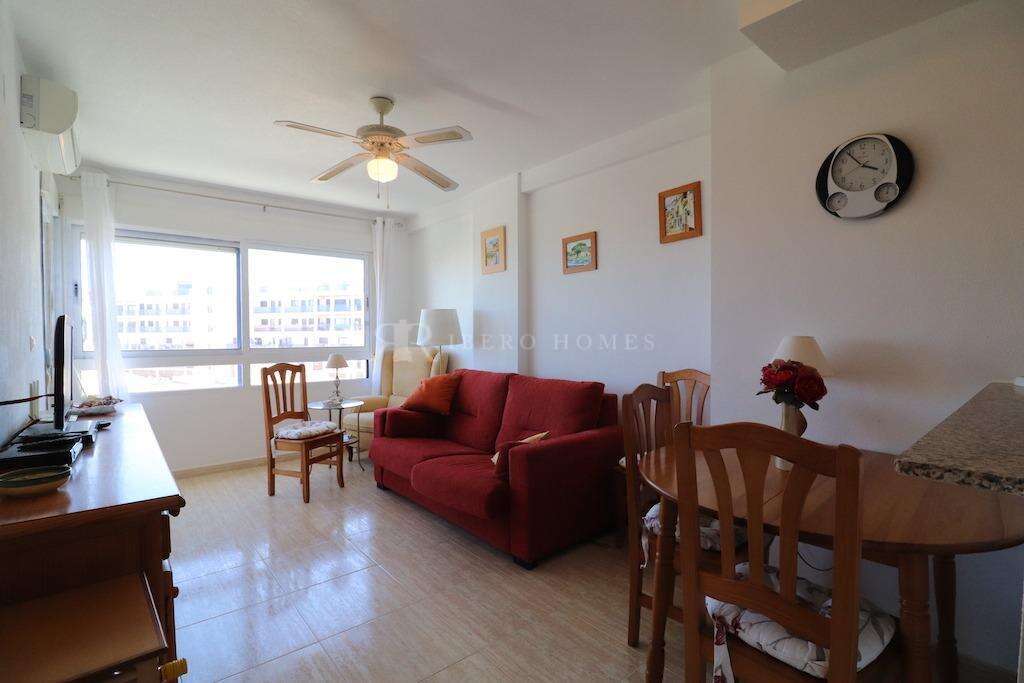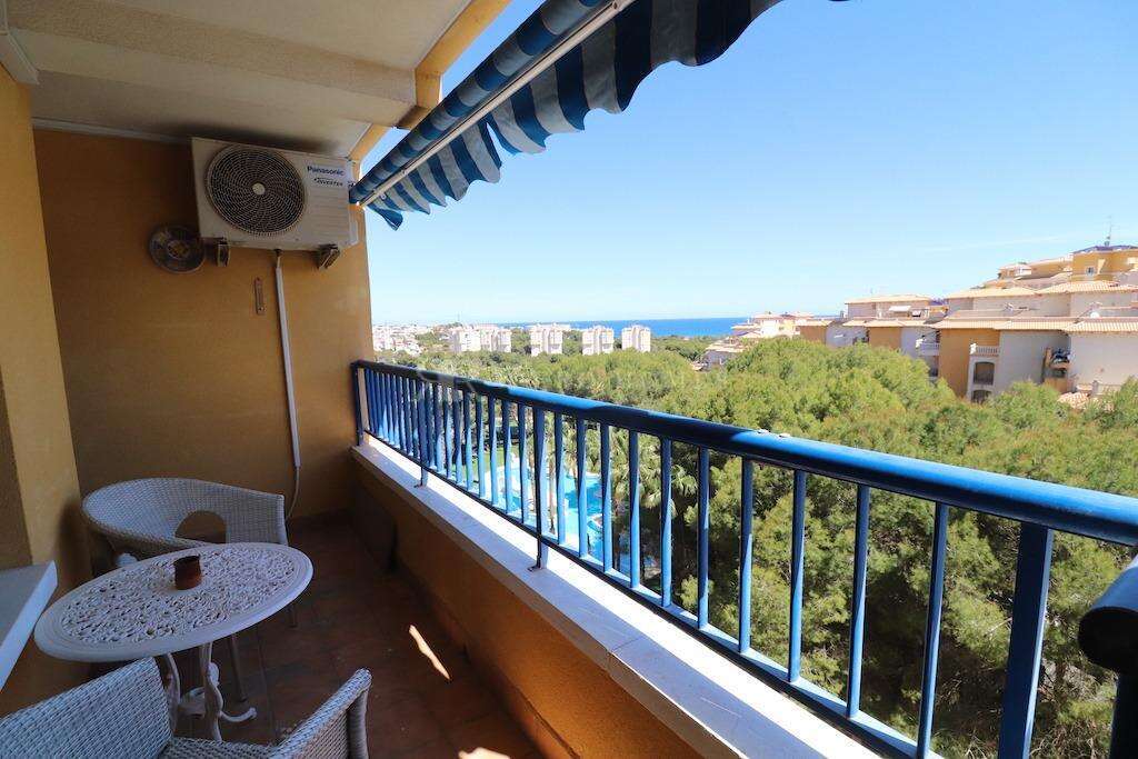 Altos de Campoamor apartamento en planta quinta con vistas al mar y a la piscina comunitaria y a los jardines, vivienda de 54 m2 con 2 dormitorios, baño, cocina americana y salón comedor, amplia terraza de 8 m2la vivienda se vende amueblada y la urbanizacion cuenta con amplias zonas verdes, tenis y piscina comunitaria, se encuentra a tan solo 700 mts de la playa y tiene orientación Sur-Este.~