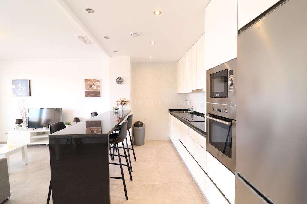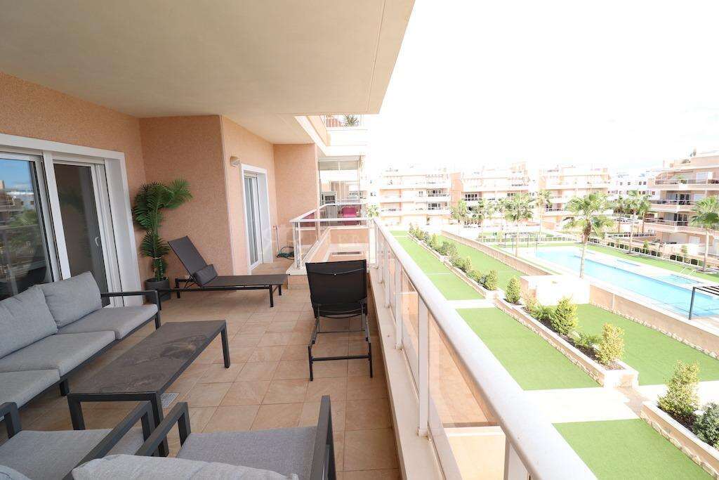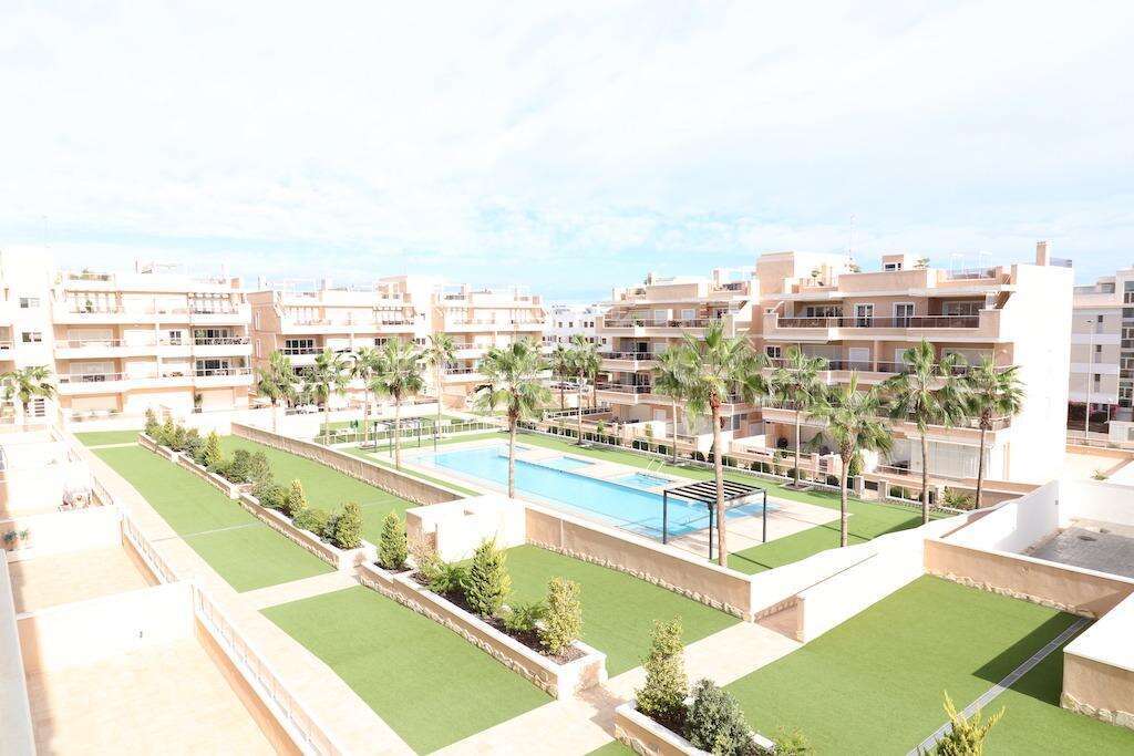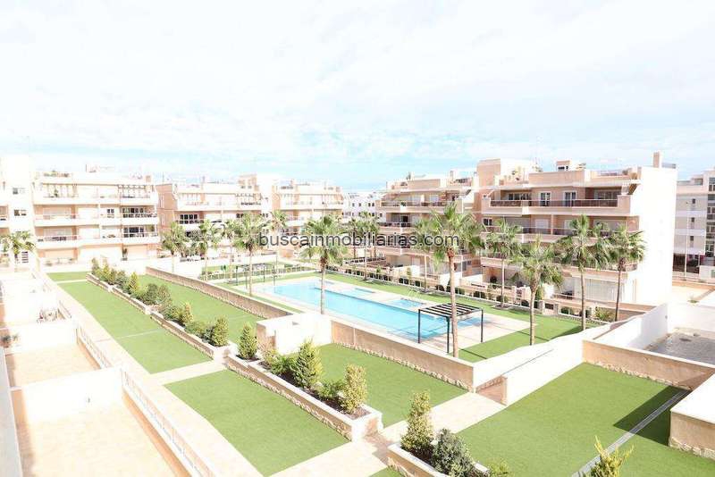 Villamartin Apartamento frente a la zona verde y a la piscina comunitaria, Residencial Vista Azul XXXI vivienda en planta segunda de 83 m2 con 3 dormitorios, 2 baños, cocina americana y un gran salón comedor, con una terraza muy amplia de 16 m2, la vivienda se vende amueblada con aire acondicionado centralizado y garaje subterráneo.~El apartamento dispone de licencia turística.~