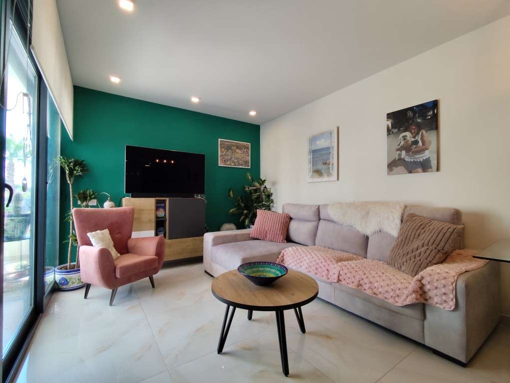 La cocina abierta se integra con el luminoso y espacioso salón, creando un espacio acogedor para relajarse o entretenerse. Desde aquí, se accede a la amplia terraza delantera, parcialmente cerrada con cortinas de cristal, lo que la hace agradable todo el año: abierta en verano y resguardada en invierno.