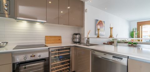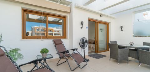 La propiedad consta de tres amplios dormitorios y dos baños. Cocina moderna totalmente equipada con electrodomésticos incluidos y un amplio salón/comedor de planta abierta, que conduce a una hermosa terraza de 23 m² con una vista fantástica sobre el área de la piscina. En esta terraza puedes disfrutar del sol de la tarde. También hay una lavandería separada y un trastero. Además, dispones de un gran solárium privado en la azotea de 72 m² con impresionantes vistas al área y al mar. En la terraza hay una gran pérgola instalada y preinstalación para un jacuzzi. La propiedad cuenta con aire acondicionado centralizado con sistema de zonas de aire. También se incluye una plaza de aparcamiento privado. El apartamento está a poca distancia a pie de muchos restaurantes, bares y tiendas.
