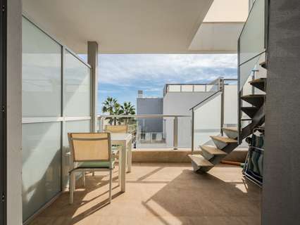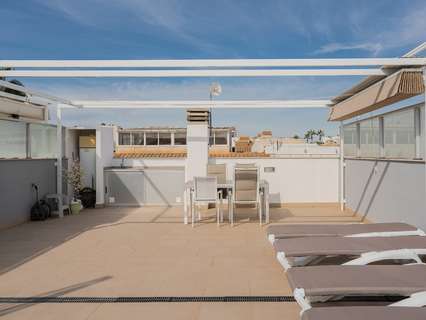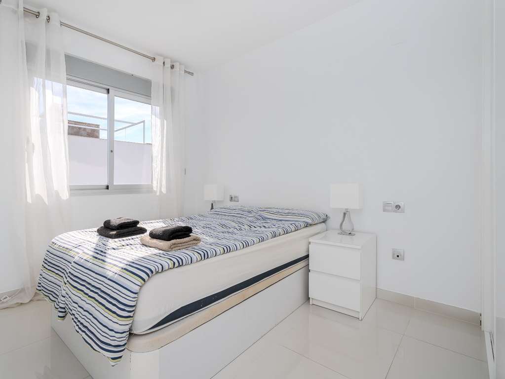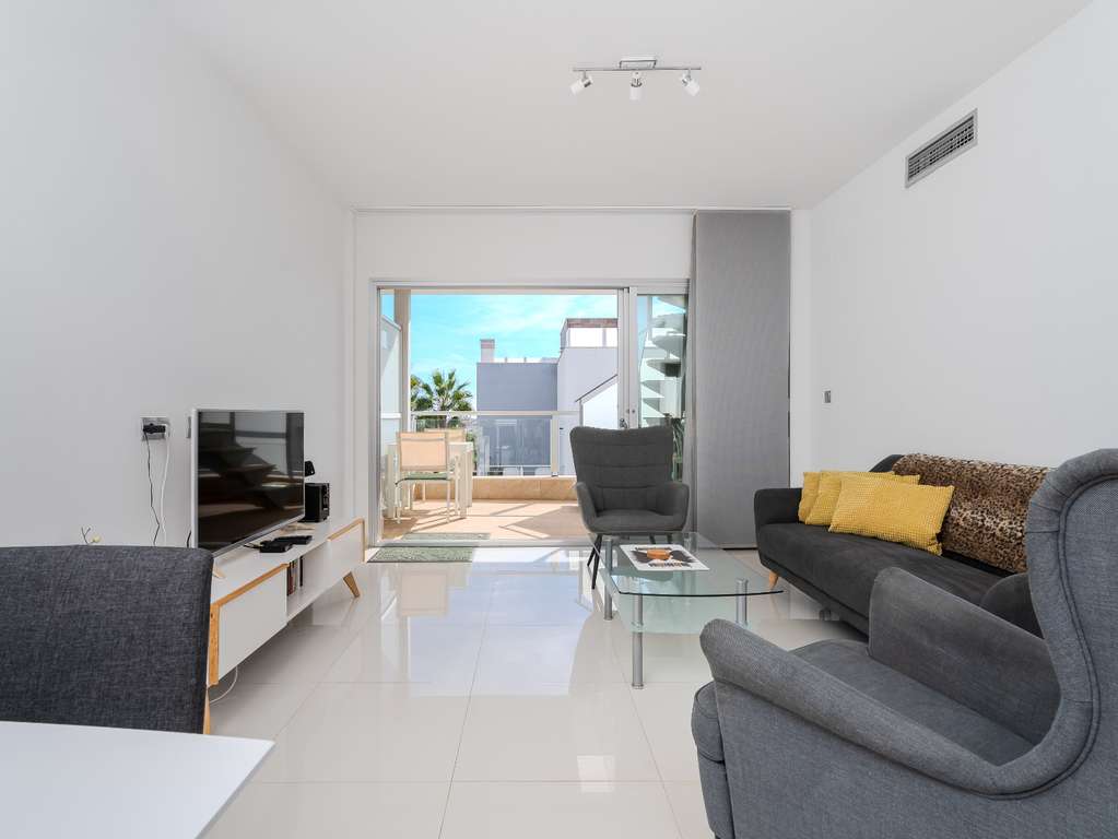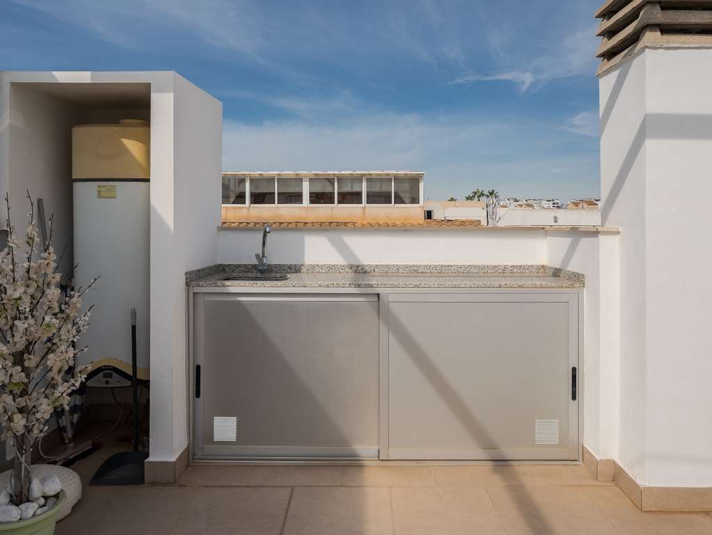 Magnífico ático con gran terraza solárium, vistas al mar y excelente ubicación Bienvenido a este precioso ático en el popular complejo Residencial Marinamed en Punta Prima, una comunidad tranquila y bien gestionada con solo 32 viviendas. Aquí encontrará un apartamento luminoso, bien cuidado y amueblado con gusto, con fantásticas vistas a la piscina y al mar, además de estar a poca distancia de todos los servicios. El apartamento cuenta con dos amplios dormitorios y dos elegantes baños. El dormitorio principal dispone de grandes armarios empotrados y baño en suite con calefacción por suelo radiante. El segundo dormitorio también es espacioso, con mucha luz natural y excelente capacidad de almacenamiento. El salón y la cocina de planta abierta ofrecen una atmósfera luminosa y acogedora. La cocina tiene electrodomésticos integrados y una práctica barra americana, mientras que el salón destaca por sus amplios ventanales y acceso directo a una agradable terraza, desde donde una escalera exterior conduce al impresionante solárium de 72 m². La terraza superior es un verdadero punto fuerte: un espacio privado donde podrá disfrutar del sol durante todo el día. Dispone de pérgola para sombra, cocina exterior con frigorífico y barbacoa, y una ducha para refrescarse. El cristal opaco aporta privacidad adicional y las vistas al mar y a Punta Prima son espectaculares. La vivienda está orientada al sureste, ofreciendo sol de mañana y sombra agradable por la tarde. Se vende completamente amueblada y equipada con aire acondicionado (frío/calor), persianas eléctricas y plaza de aparcamiento privada. Residencial Marinamed ofrece una hermosa zona comunitaria con piscinas para adultos y niños, rodeada de césped artificial, palmeras y vegetación, creando un ambiente agradable con bajos costes de comunidad. Viva en el corazón de Punta Prima, en un entorno tranquilo y a poca distancia de restaurantes, tiendas, supermercados y todas las comodidades. El popular Centro Comercial Punta Marina se encuentra a solo cinco minutos a pie, y la playa está muy cerca. Una oportunidad única para adquirir un ático en uno de los complejos más codiciados y bien gestionados de Punta Prima – perfecto como vivienda vacacional, inversión o residencia permanente bajo el sol de España.