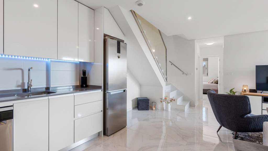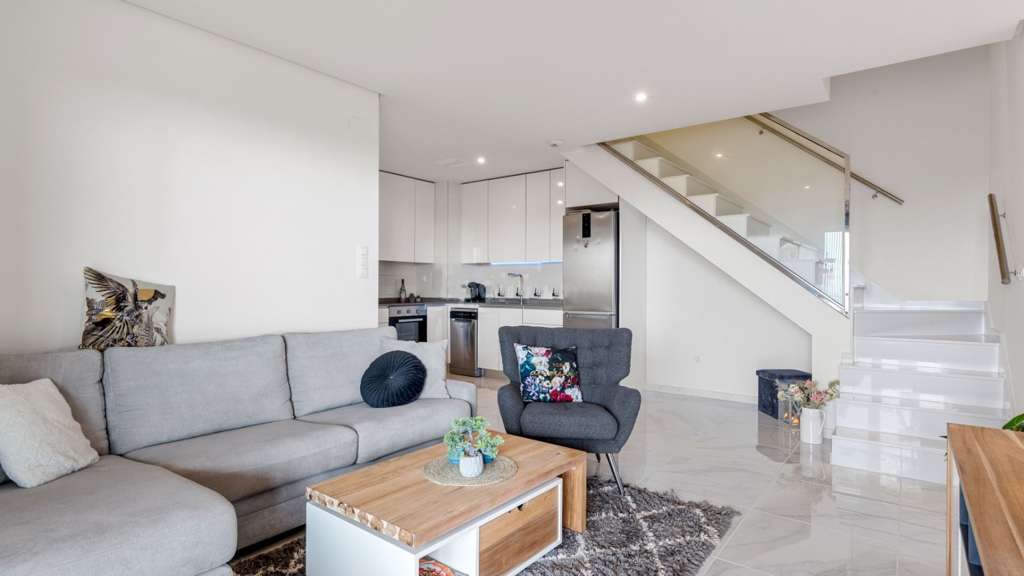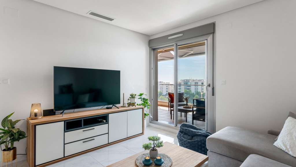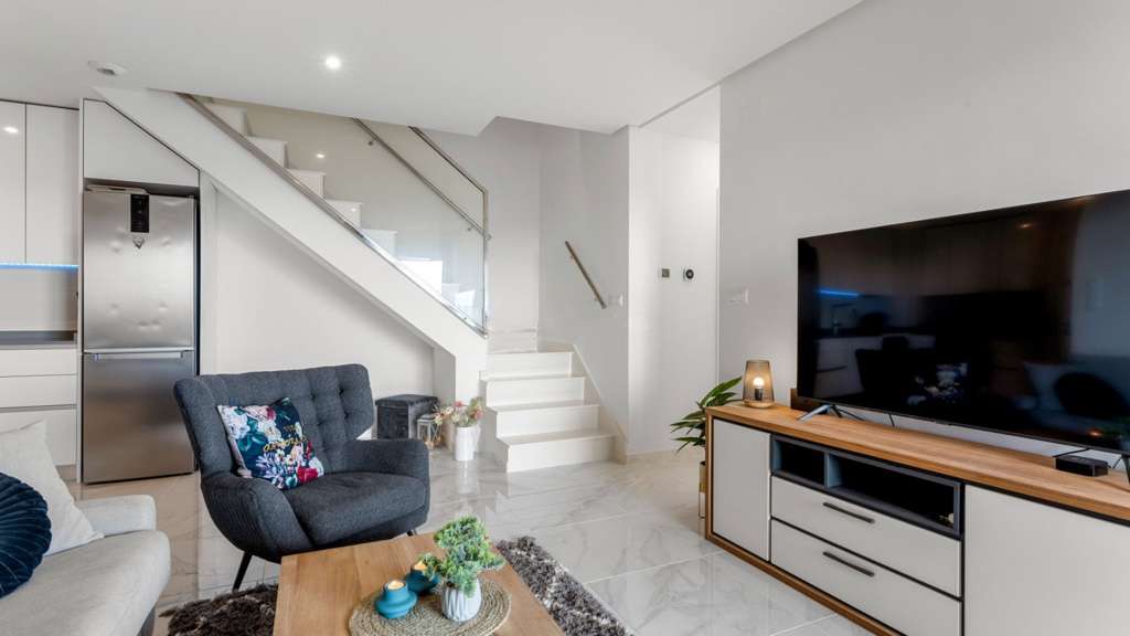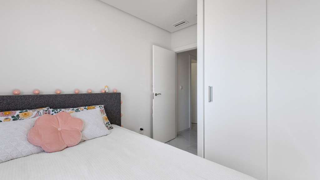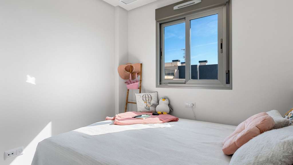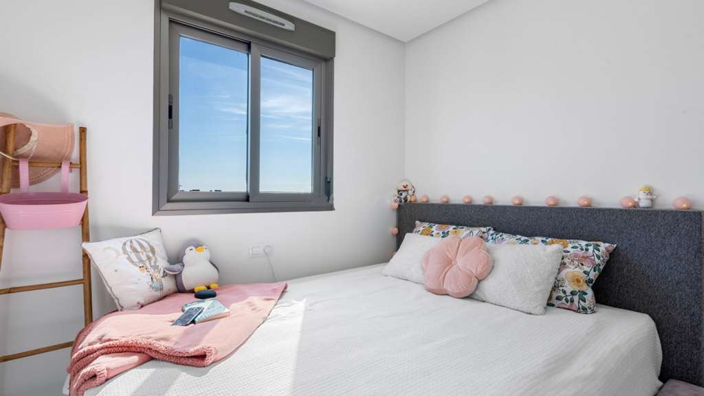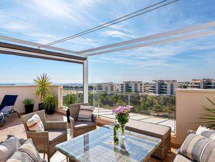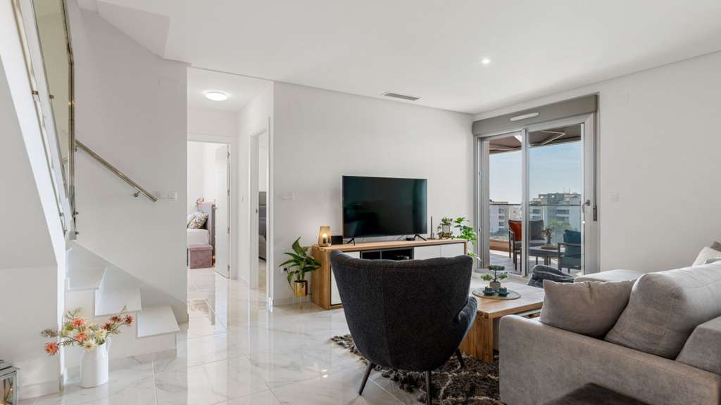 Se vende atico a poca distancia a pie del centro comercial Zenia Boulevard. La casa tiene una buena distribución y consta de tres dormitorios, así como un salón-cocina abierto con acceso a una terraza orientada al sur de aprox. 20 metros cuadrados. Se incluyen 1 plaza de garaje y 1 trastero en el aparcamiento subterráneo. Hay ascensor en el edificio.El apartamento mantiene un alto nivel y parece luminoso y moderno con opciones de materiales de primera línea. Esto incluye calefacción por suelo radiante en el baño, aire acondicionado frío y calor, una terraza acristalada con protección solar y una mesa de comedor para 6-8 personas, así como una azotea amueblada de casi 50 metros cuadrados.La zona común del complejo es completamente independiente, con un total de 3 piscinas, una de ellas cerrada y climatizada. También hay una sauna finlandesa y un gimnasio. Villamartín está a 2 km de las playas de arena blanca de La Zenia y a 20 minutos a pie del centro comercial Zenia Boulevard. Es importante mencionar que el conjunto habitacional cuenta con un área verde protegida directamente al frente, lo que brinda aire y vista verde desde el área común.