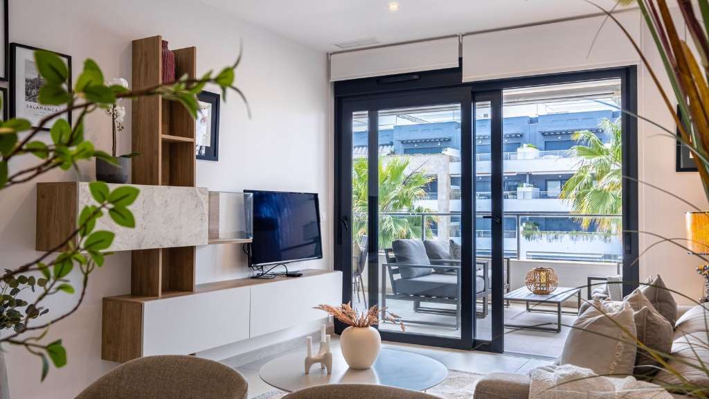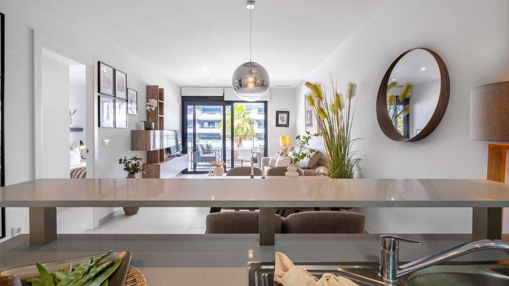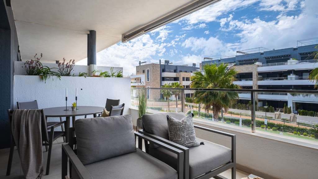 Se vende apartamento moderno en ¨Flamenca Village¨, Orihuela CostaEl complejo ¨Flamenca Village¨ con jardineras, grandes maceteros, pórticos de piedra que completan un recorrido paisajístico lleno de flora autóctona que florece en un paisaje en el que no faltan lago, fuentes, piscina con zona lounge chill out integrada, jacuzzis, y zona acuática de juegos infantiles. Su gimnasio acristalado con vistas panorámicas sobre el lago, sala de ejercicio y sauna finlandesa.La vivienda tiene 2 habitaciones, 2 baños, salon comedor con cocina americana, terraza soleada de 19 m2 y plaza de parking.