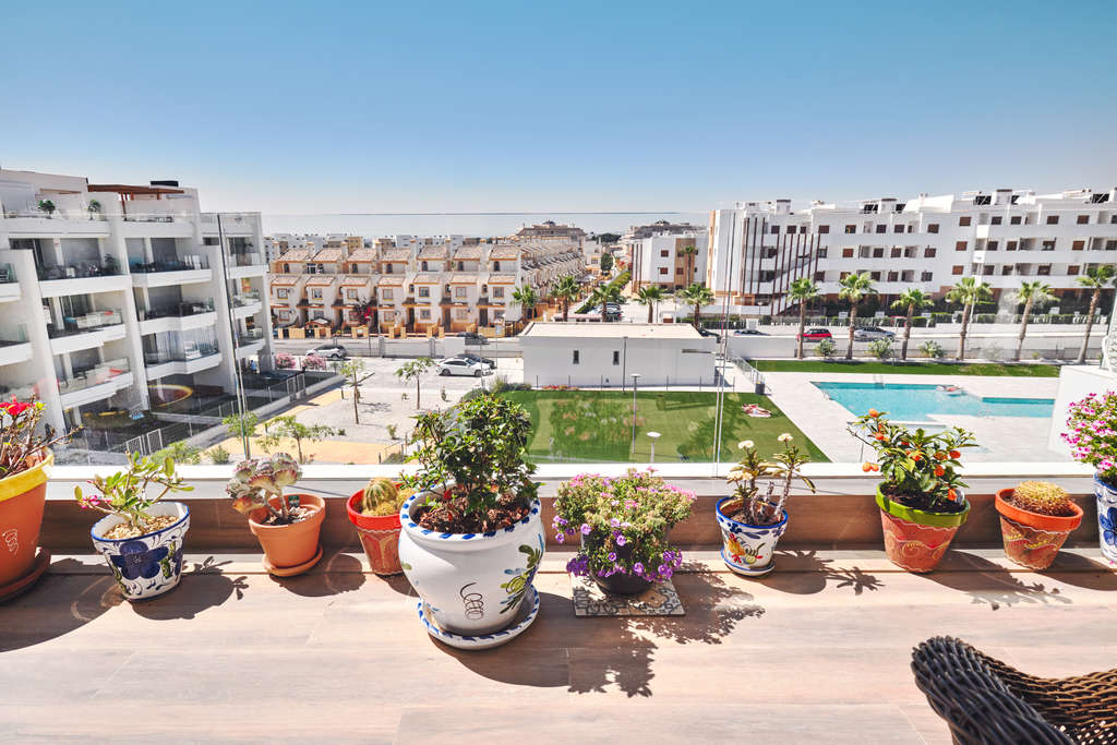 En venta ático en Villamartín, Orihuela Costa. Se vende apartamento moderno de dos dormitorios y dos baños con una gran terraza privada, situado en una comunidad cerrada con una gran piscina comunitaria y a poca distancia de una variedad de servicios en la popular y solicitada zona de Villamartín en Orihuela Costa.Construido en 2023, este impresionante apartamento es accesible mediante ascensor y cuenta con una gran piscina comunitaria con plantas y árboles consolidados, gimnasio exterior, zona de juegos infantiles y amplio espacio para tomar el sol y relajarse en las zonas comunes. El apartamento consta de un amplio y luminoso salón-comedor de planta abierta con cocina moderna totalmente equipada y una puerta que da a un lavadero independiente con lavadora y caldera. El salón cuenta con puertas correderas que dan a una terraza con zona de estar. El dormitorio principal es amplio y cuenta con armario empotrado, baño en suite con ducha a ras de suelo y puertas correderas que dan a la terraza. El segundo dormitorio también es doble y amplio, con armarios empotrados, y junto a él se encuentra el segundo baño familiar, también con ducha a ras de suelo.Unas escaleras interiores desde el salón conducen a la amplia azotea privada con preciosas vistas a la piscina comunitaria, los jardines y los alrededores. La terraza está equipada con una pérgola para dar sombra y una ducha exterior.El apartamento cuenta con numerosos extras, como toldos eléctricos, aire acondicionado frío/calor por conductos, plaza de aparcamiento asignada, suelo radiante en los baños y persianas eléctricas.No pierda esta fantástica oportunidad de adquirir el apartamento perfecto para entrar a vivir en una ubicación inmejorable. ¡Reserve su visita hoy mismo!