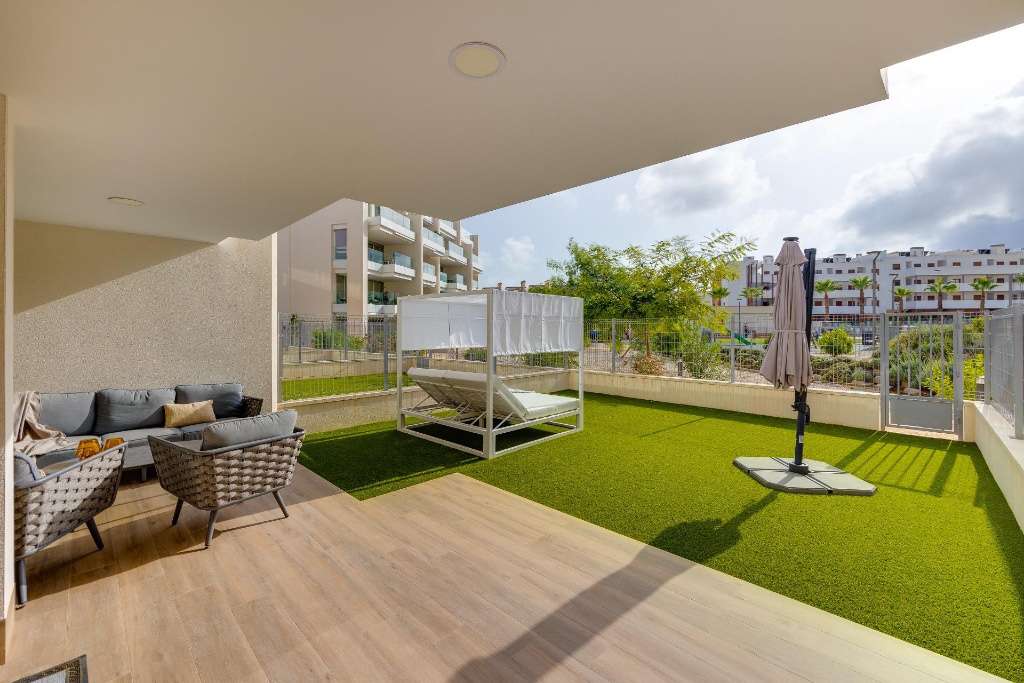 Se vende apartamento bajo en Res. Ema, Villamartín.Apartamento prácticamente nuevo, construido en 2023, situado en uno de los residenciales más exclusivos y tranquilos de Villamartín (Orihuela Costa), RESICENCIAL EMA. Un hogar perfecto tanto para vivir todo el año como para disfrutar de unas vacaciones junto al mar.El residencial es cerrado y muy completo, con amplias zonas verdes, parque infantil, piscinas comunitarias para adultos y niños, y espacios comunes ideales para relajarse o disfrutar en familia. Además, se encuentra cerca de todos los servicios esenciales: supermercados, restaurantes, zonas de ocio, campos de golf y a pocos minutos de las playas de Orihuela Costa.La vivienda destaca por su diseño moderno y luminoso. Dispone de un amplio salón-comedor con cocina abierta completamente equipada con electrodomésticos de última generación y acceso a una galería y zona de lavandería. 2 dormitorios dobles con armarios empotrados y 2 baños completos con plato de ducha, uno de ellos en suite. Desde el salón y uno de los dormitorios se accede a una terraza con jardín privado de 60m2, muy soleada gracias a su orientación sur, ideal para disfrutar del clima mediterráneo durante todo el año.Además, la propiedad incluye plaza de parking privada dentro del residencial y zona de aparcamiento para bicicletas.