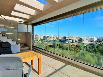 Este impresionante ático orientado al Este se encuentra en el codiciado residencial Altos del Mediterráneo en Los Dolses, ofreciendo excepcionales vistas al mar Mediterráneo y al Mar Menor. Ubicado en el Bloque 3, con ascensor, destaca por su diseño moderno, amplias zonas exteriores y su inmejorable proximidad a todos los servicios. La vivienda ofrece un luminoso salón-comedor con cocina moderna de concepto abierto, dos dormitorios dobles con armarios empotrados y dos baños contemporáneos, uno de ellos en suite en el dormitorio principal. Tanto el salón como el dormitorio principal tienen acceso directo a un balcón soleado orientado al Este con cortinas de cristal, ideal para disfrutar durante todo el año. Desde el balcón se accede mediante una escalera exterior al impresionante solárium privado, que ofrece vistas panorámicas al mar, al Mar Menor, La Manga y la costa. El solárium también cuenta con un trastero, perfecto para mobiliario exterior o enseres personales. La vivienda incluye una plaza de aparcamiento dentro de la comunidad cerrada, además de zonas comunes muy bien cuidadas y acceso a excelentes instalaciones: piscina exterior, piscina climatizada interior, gimnasio, sauna y áreas ajardinadas. Ubicada a un paso de supermercado, tiendas, bares, restaurantes y parada de autobús, la propiedad también está a poca distancia andando de Zenia Boulevard, Villamartin Plaza y Villamartin Golf. Una oportunidad excepcional para vivir todo el año, pasar vacaciones o invertir en alquiler en una de las mejores zonas de la Orihuela Costa.