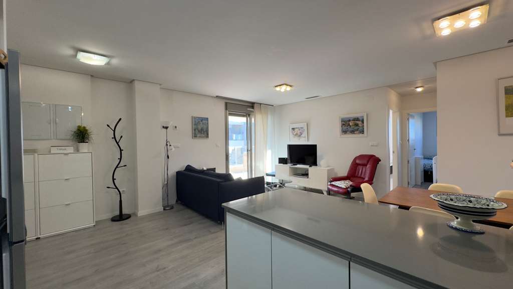 El apartamento cuenta con dos dormitorios y dos baños , uno de ellos en suite . El amplio y luminoso salón se integra a la perfección con la cocina abierta y totalmente equipada .