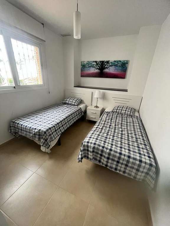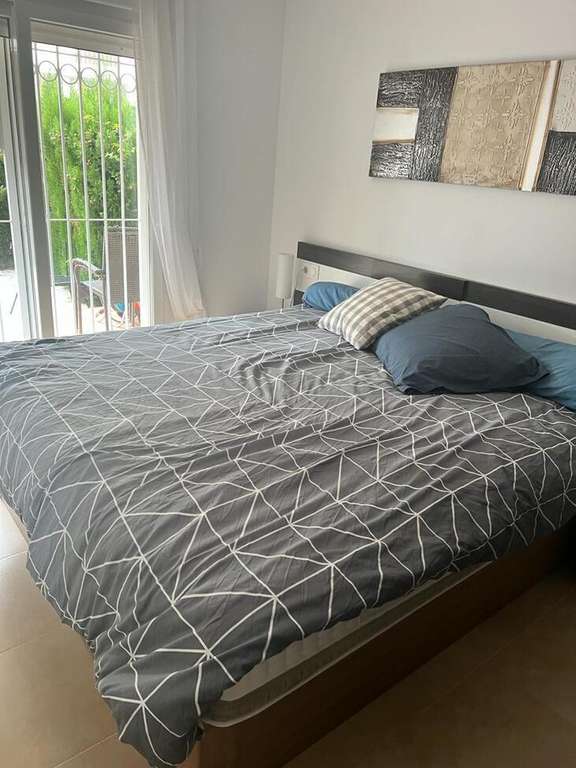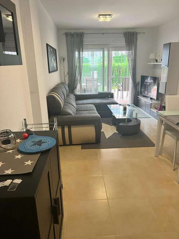 Este apartamento en planta baja consta de tres dormitorios, dos baños y un salón con cocina americana. Desde el salón tenemos entrada a la terraza con jardín. Junto a la cocina hay un lavadero/trastero. La propiedad se vende amueblada, con electrodomésticos y aire acondicionado por conductos. El complejo cerrado tiene un parking para los residentes. El complejo ofrece una gran piscina, jacuzzi y zonas verdes. Está cerca de los centros comerciales La Fuente y Villamartín Plaza, varios supermercados, bares y restaurantes.