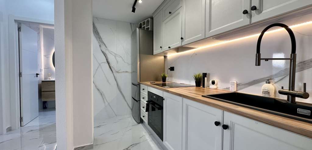 El interior cuenta con 1 dormitorio, baño moderno con ducha, y un acogedor salón con salida a un balcón de 6,5 m². Equipamiento de alta calidad: electrodomésticos LG y Samsung, aire acondicionado inverter, televisor inteligente de 55”, lavadora-secadora, suelo radiante, detectores de humo y videovigilancia Wi-Fi.