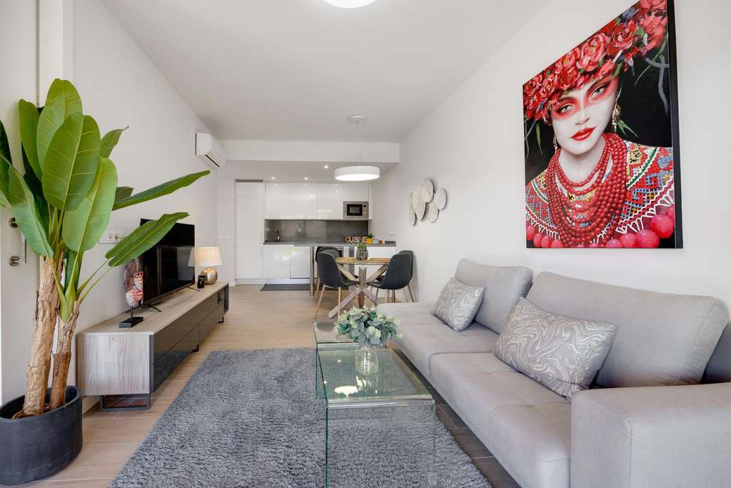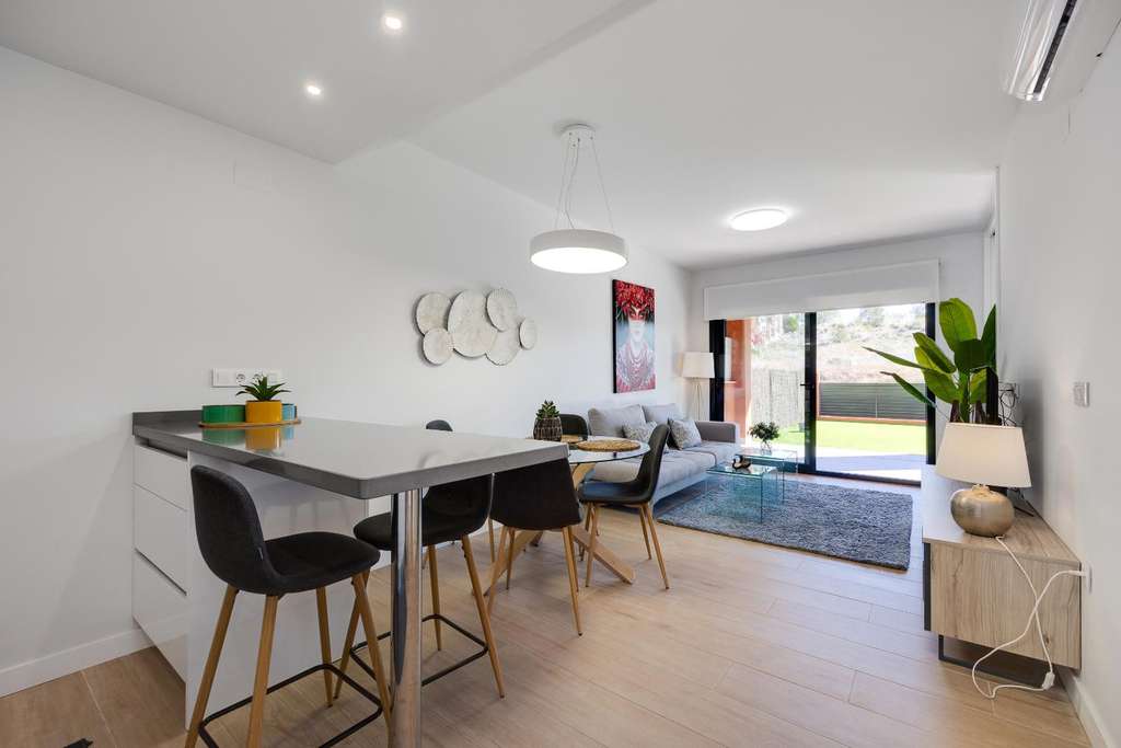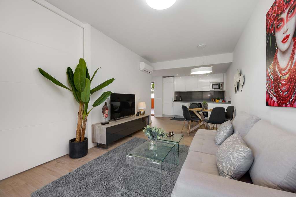 Presentamos esta magnífica propiedad situada en planta baja, ideal tanto como residencia habitual como inversión para alquiler vacacional. El apartamento cuenta con una superficie construida de 106 m² y ofrece un diseño funcional y confortable, distribuido en dos amplios dormitorios y dos baños completos.La vivienda destaca por sus espacios exteriores: dispone de dos terrazas, un luminoso patio interior y un espectacular jardín privado de 79 m², perfecto para disfrutar de momentos al aire libre con privacidad y tranquilidad.Entre sus características, incluye aire acondicionado y calefacción, lo que garantiza el máximo confort durante todo el año. Se entrega completamente amueblado, con una decoración actual y lista para entrar a vivir.La propiedad forma parte de un complejo residencial con ascensor, piscina comunitaria y zonas ajardinadas comunes. Además, cuenta con una plaza de parking subterránea incluida en el precio, lo que aporta un valor añadido y una gran comodidad.En resumen, una vivienda muy completa, bien equipada y ubicada en una zona residencial que combina tranquilidad y buenas conexiones. Ideal para quienes buscan calidad de vida y espacios al aire libre sin renunciar a los servicios modernos.