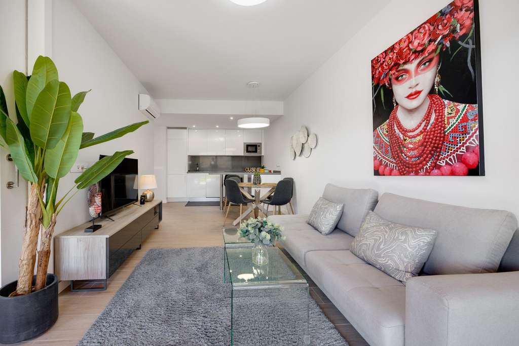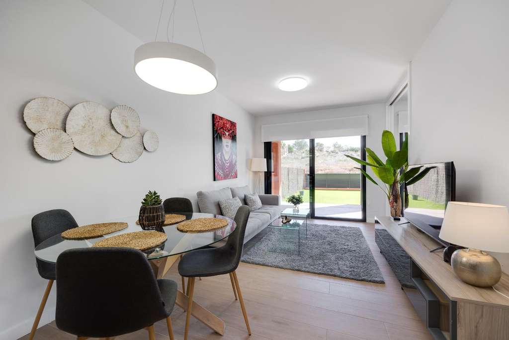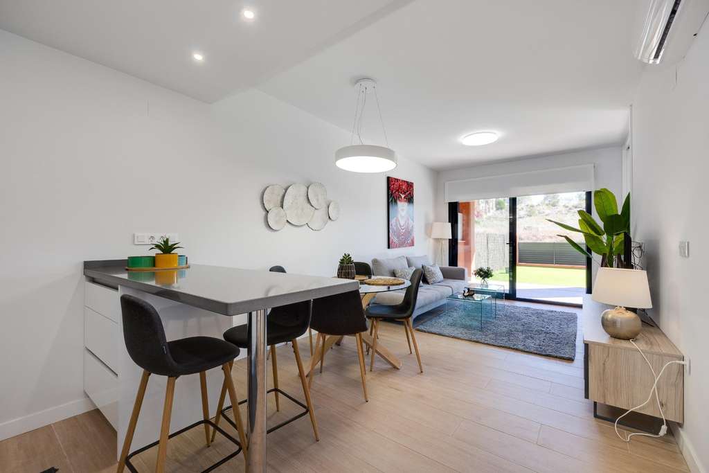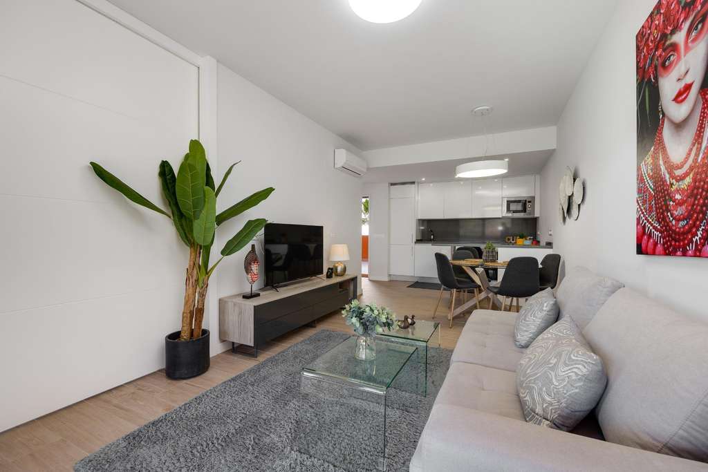 Presentamos esta magnífica propiedad situada en planta baja, ideal tanto como residencia habitual como inversión para alquiler vacacional. El apartamento cuenta con una superficie construida de 106 m² y ofrece un diseño funcional y confortable, distribuido en dos amplios dormitorios y dos baños completos. La vivienda destaca por sus espacios exteriores: dispone de dos terrazas, un luminoso patio interior y un espectacular jardín privado de 79 m², perfecto para disfrutar de momentos al aire libre con privacidad y tranquilidad. Entre sus características, incluye aire acondicionado y calefacción, lo que garantiza el máximo confort durante todo el año. Se entrega completamente amueblado, con una decoración actual y lista para entrar a vivir. La propiedad forma parte de un complejo residencial con ascensor, piscina comunitaria y zonas ajardinadas comunes. Además, cuenta con una plaza de parking subterránea incluida en el precio, lo que aporta un valor añadido y una gran comodidad. En resumen, una vivienda muy completa, bien equipada y ubicada en una zona residencial que combina tranquilidad y buenas conexiones. Ideal para quienes buscan calidad de vida y espacios al aire libre sin renunciar a los servicios modernos.