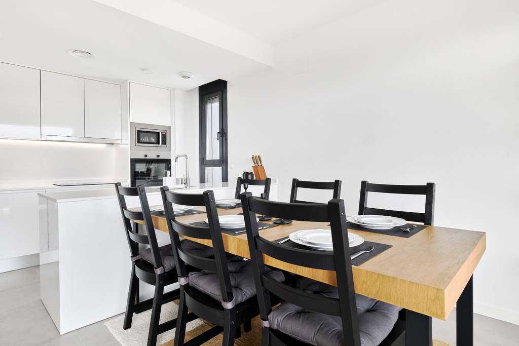 La estancia principal de la casa es un amplio espacio diáfano que integra la cocina, el comedor y la sala de estar, creando un ambiente acogedor y armonioso. Grandes puertas correderas de cristal dan a un balcón orientado al sureste , ideal para disfrutar del sol de la mañana, desayunar al aire libre o relajarse con vistas impresionantes y un ambiente marítimo.