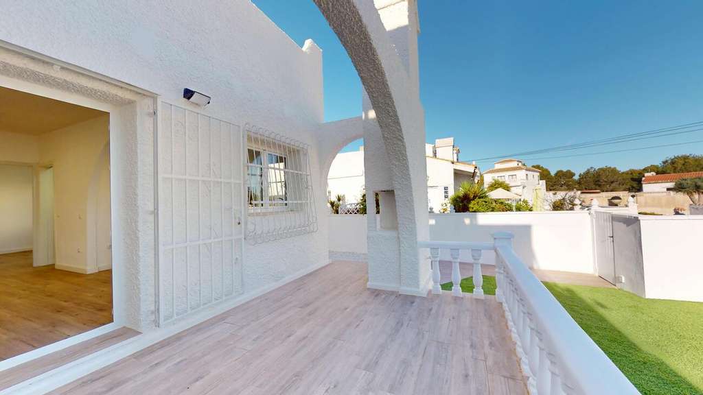 Descubra esta hermosa casa renovada que ofrece dos dormitorios versátiles, ideales para vivir en familia, recibir invitados o crear un espacio de trabajo. El baño completo cuenta con una moderna ducha con una elegante mampara nueva, que combina comodidad y estilo. La cocina, a estrenar, está totalmente equipada con electrodomésticos de última generación, como lavadora y lavavajillas, listos para que los disfrute desde el primer día. En toda la casa, el suelo laminado efecto madera aporta calidez y elegancia.✨ Características de la propiedad: Superficie habitable: 58 m². Parcela: 202 m², incluyendo 147 m² de jardín privado. Solárium privado: 48 m² con césped artificial y brezo lateral para una total privacidad. Trastero para mayor comodidad. Posibilidad de instalar una piscina privada (a cargo del comprador). La casa presenta acabados en tonos limpios y modernos con puertas, ventanas y paredes blancas, mientras que el exterior cuenta con suelo cerámico efecto madera que complementa a la perfección el estilo del interior. El amplio jardín de 147 m² es ideal para vivir al aire libre, tomar el sol o entretenerse, y ofrece un amplio espacio si desea agregar una piscina privada. Esta propiedad está lista para mudarse, cuidadosamente diseñada y es perfecta para disfrutar tanto de la comodidad interior como de la vida al aire libre.