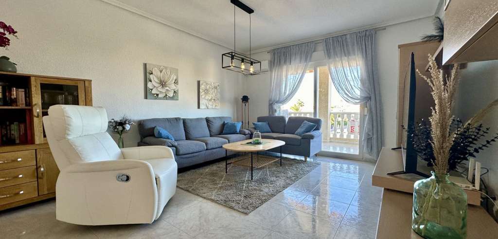 La gran terraza ofrece un amplio espacio exterior.Ubicado en la 3ª planta (sin ascensor), el apartamento está a pocos pasos de supermercados, restaurantes, tiendas, karting, parque acuático y a solo 6 minutos de La Zenia Boulevard. La playa está a 13 minutos a pie y el aeropuerto de Alicante a 40 minutos.