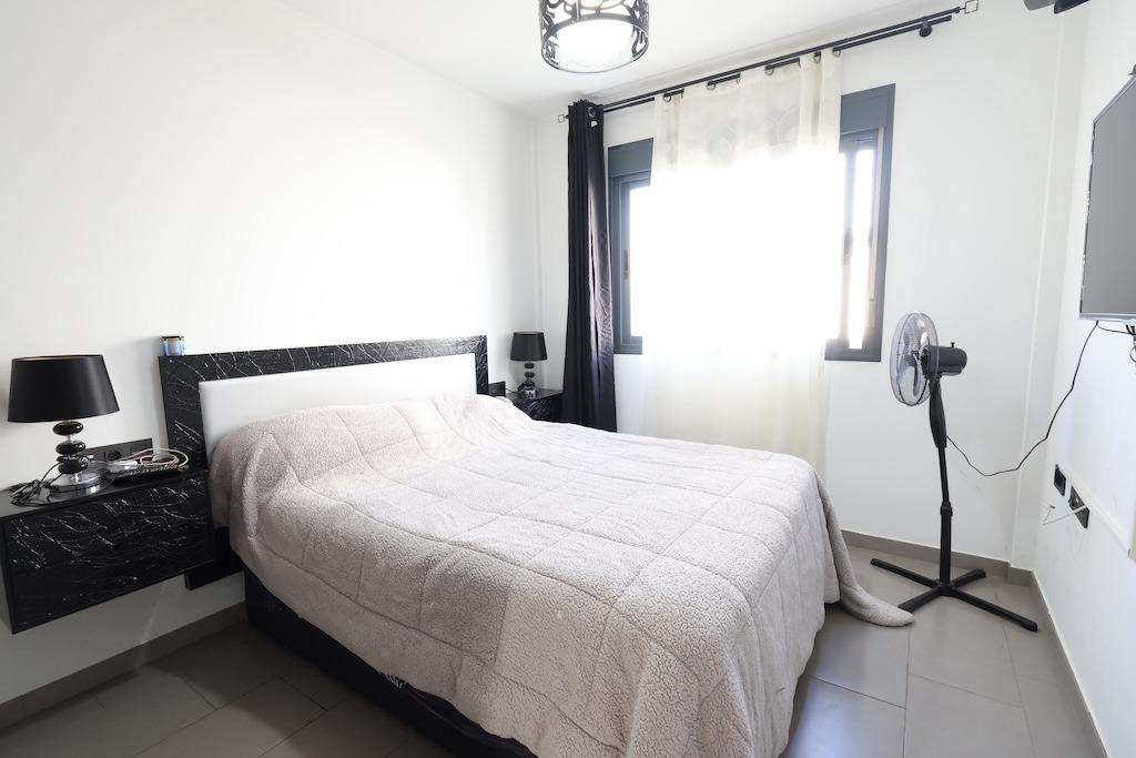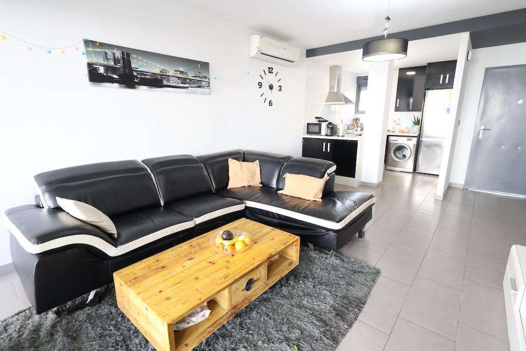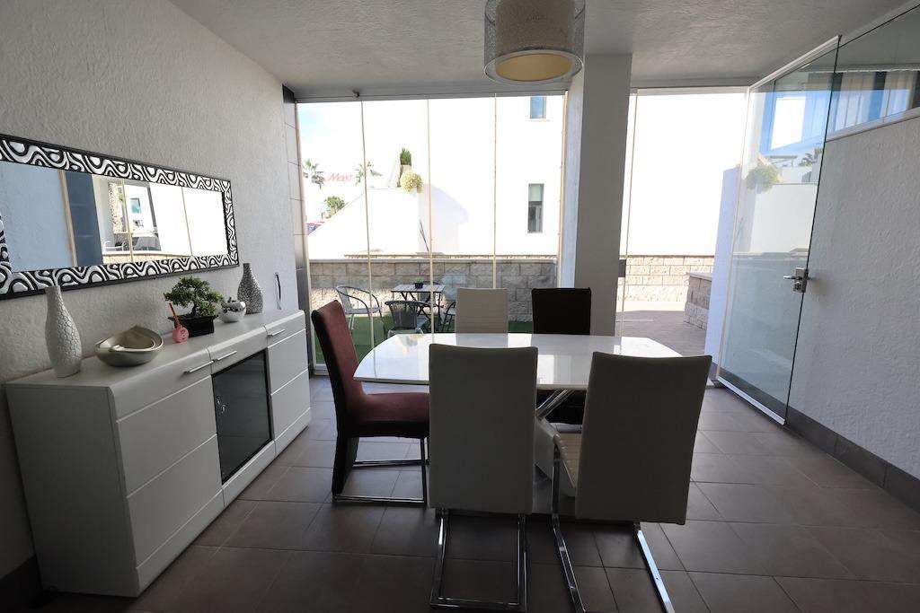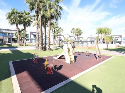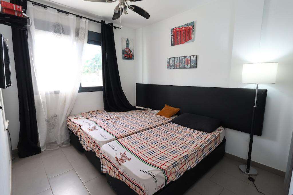 Bungalow en planta baja con dos jardines: uno de 13 m2 con acceso directo a la zona de la piscina comunitaria, y otro de 6 m2 en la parte trasera de la vivienda. La propiedad cuenta con 77 m2 distribuidos en 2 dormitorios, 2 baños, cocina americana abierta al salón-comedor y una terraza acristalada. Se vende amueblada y equipada con aire acondicionado. Incluye plaza de aparcamiento exterior. El residencial ofrece amplias zonas verdes, área infantil y está ubicado junto al centro comercial Zenia Boulevard.
