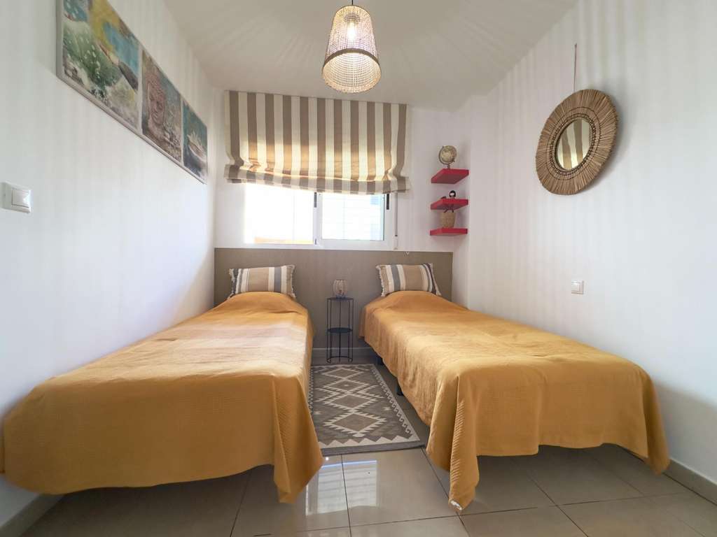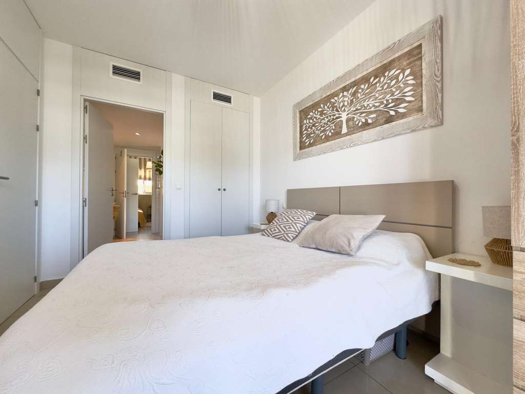 Este encantador apartamento, ubicado en la segunda planta de un moderno complejo residencial cerrado, ofrece un estilo de vida cómodo y tranquilo. Con una distribución bien pensada, la vivienda cuenta con dos dormitorios amplios. Ambos dormitorios comparten un baño espacioso y bien iluminado, con acceso directo desde cada habitación, lo que aporta una gran funcionalidad para su uso diario.~~El salón, amplio y luminoso, se conecta con una cocina americana completamente equipada, que incluye electrodomésticos, perfectos para quienes disfrutan de la cocina abierta. Este diseño de concepto abierto facilita la integración de los espacios, haciendo que el ambiente sea más amplio y acogedor. Además, desde el salón, se accede a un balcón de 15 metros, ideal para disfrutar de vistas despejadas y de un buen momento al aire libre, ya sea para tomar el sol, leer o compartir una comida al fresco.~~El apartamento también cuenta con un práctico lavadero, que aporta un toque de funcionalidad adicional al hogar, permitiendo organizar mejor el espacio y mantener todo en orden.~~El complejo residencial El Bosque es muy popular, con acceso restringido y zonas comunes muy cuidadas. Uno de los principales atractivos del lugar es su gran piscina, rodeada de césped natural, perfecta para disfrutar durante los cálidos días de verano. La piscina ofrece un espacio para relajarse, hacer ejercicio o pasar tiempo con la familia y amigos.~~Por último, el apartamento incluye una plaza de parking privada, lo que añade un plus de comodidad y seguridad al contar con espacio exclusivo para el estacionamiento de vehículos. Este apartamento es ideal para quienes buscan una vivienda tranquila, moderna y bien equipada en una ubicación residencial exclusiva.