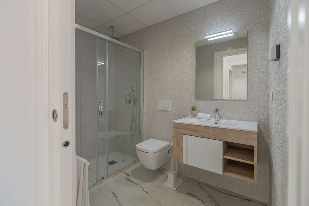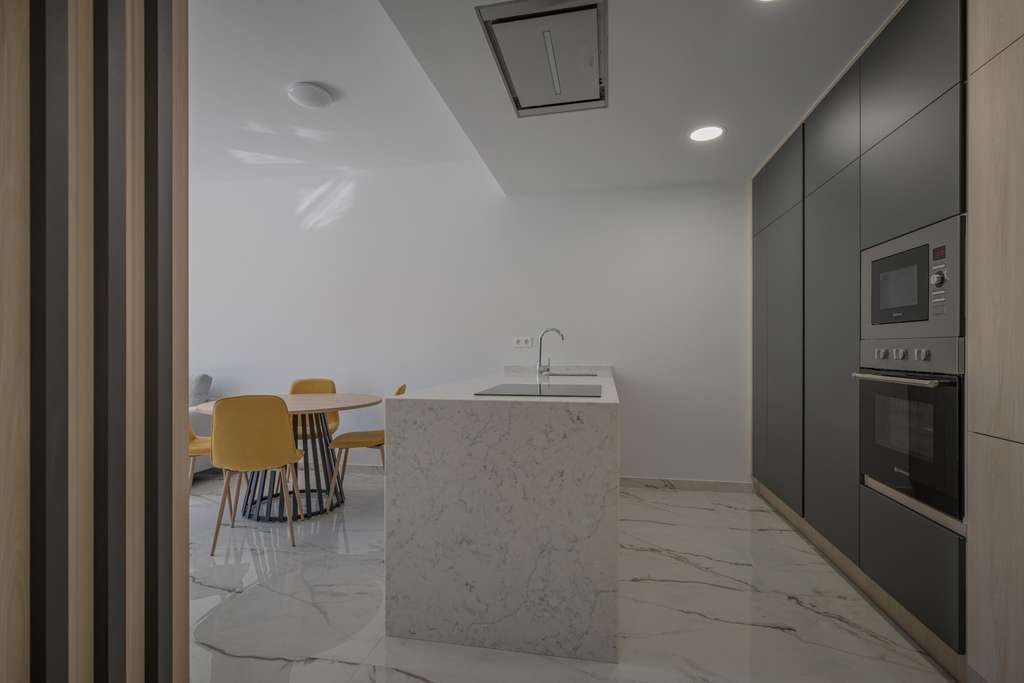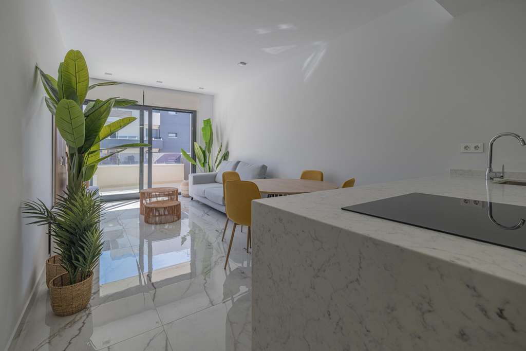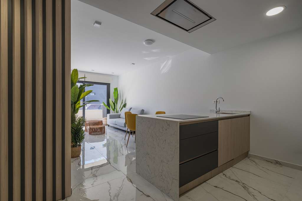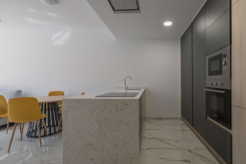 La vivienda dispone de dos amplios dormitorios con buena iluminación natural y dos baños completos equipados con ducha y acabados contemporáneos. La zona de día ofrece un espacio abierto y luminoso donde la cocina moderna, de concepto abierto, se integra perfectamente con el salón-comedor, creando un ambiente cómodo y actual, ideal tanto para la vida diaria como para recibir invitados.