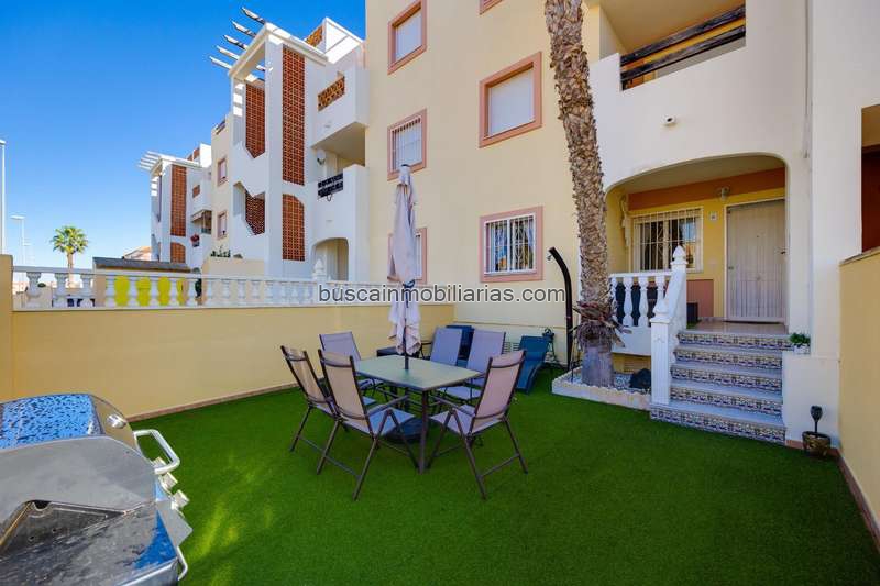 Apartamento en La Zenia, con 65 m2 construidos, 30 metros de jardín, 2 dormitorios, 1 baños, 1 garaje/s, buen estado, exterior, planta Baja, 2 armarios, cocina amueblada, patio, amueblado, orientación suroeste, 2006, zonas verdes, piscina comunitaria, aire acondicionado frío/calor, agua caliente centralizada, gastos de comunidad/mes de 28 €, suelo de gres