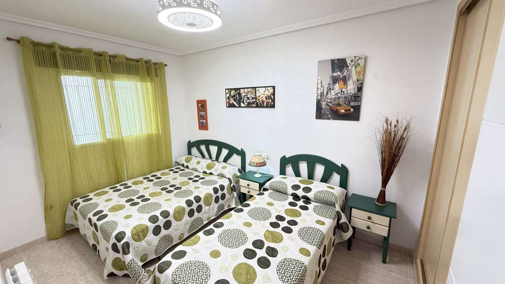 Ubicado en la hermosa urbanización de Zeniamar, en pleno centro turístico de la Costa Blanca, pero con total tranquilidad, este encantador bungalow en planta baja es una auténtica joya. La comunidad es conocida por su impecable mantenimiento, sus exuberantes zonas verdes y su atractiva piscina. La propiedad ofrece una amplia terraza delantera con barbacoa de obra. En el interior, encontrará un luminoso salón con una cocina americana recientemente renovada, totalmente equipada con electrodomésticos modernos. Junto a la cocina hay un amplio lavadero. El bungalow también incluye dos amplios dormitorios con armarios empotrados, un trastero adicional y un baño. Todas las habitaciones están equipadas con calefacción y aire acondicionado, lo que garantiza comodidad durante todo el año. Perfectamente ubicado a solo 2 km de La Zenia Boulevard, a 2,5 km del mar y a unos 45 minutos del aeropuerto de Alicante. Una vivienda ideal para quienes buscan paz y relajación en el vibrante corazón de la Costa Blanca.