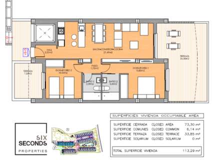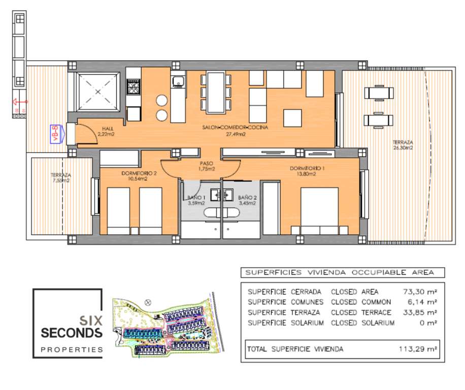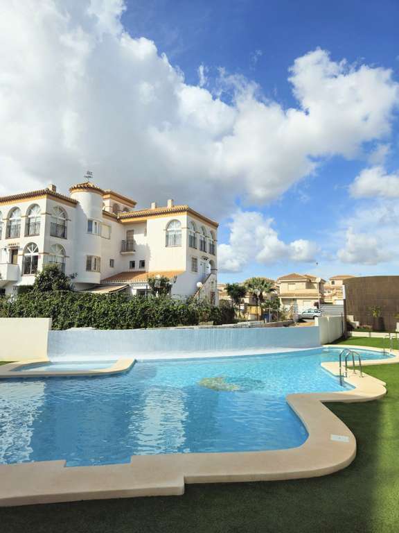 Descubra este elegante apartamento en planta baja en Playa Flamenca, Orihuela Costa, una ubicación privilegiada en la Costa Blanca que combina tranquilidad, estilo de vida mediterráneo y cercanía a todos los servicios. Esta acogedora vivienda de estilo mediterráneo cuenta con 2 dormitorios y 2 baños, diseñada para ofrecer comodidad, funcionalidad y luminosidad en cada espacio. El corazón del hogar lo forma un moderno salón-comedor con cocina abierta, un concepto actual que conecta perfectamente con el resto de la vivienda y crea un ambiente ideal tanto para la vida diaria como para recibir invitados. Desde el salón se accede a una agradable terraza privada, perfecta para disfrutar del clima soleado durante todo el año, desayunar al aire libre o relajarse al final del día. La propiedad forma parte de una cuidada urbanización con piscina comunitaria, rodeada de zonas comunes ideales para el descanso y el ocio. Su excelente ubicación permite llegar fácilmente al mar y a las playas de Orihuela Costa, así como a prestigiosos campos de golf, al popular centro comercialla Zenia y a una amplia oferta de restaurantes, tiendas y servicios. Esta vivienda representa una oportunidad ideal tanto como residencia habitual, segunda vivienda en la Costa Blanca o inversión inmobiliaria, combinando ubicación estratégica, confort y el auténtico estilo de vida mediterráneo.