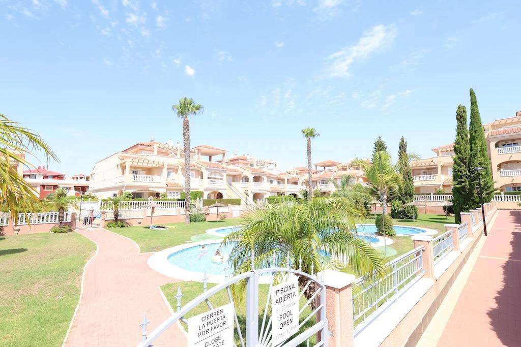 Encantador bungalow en planta baja ubicado frente a una zona verde en uno de los residenciales más valorados de la zona. La vivienda cuenta con una superficie de 75 m2 distribuidos en 2 dormitorios con armarios empotrados, 2 baños completos (uno en suite), un luminoso salón-comedor, cocina americana con galería cerrada y una acogedora terraza acristalada perfecta para disfrutar todo el año.. . El jardín privado de unos 46 m2 ofrece espacio ideal para relajarse o disfrutar de comidas al aire libre. La propiedad se vende completamente amueblada, equipada con aire acondicionado y además incluye un garaje subterraneo.. . El residencial dispone de una hermosa piscina comunitaria rodeada de cuidados jardines, creando un entorno tranquilo y agradable. Situado cerca de todos los servicios, supermercados, restaurantes y a pocos minutos de las playas de Orihuela Costa. Ideal como residencia habitual o para vacaciones.