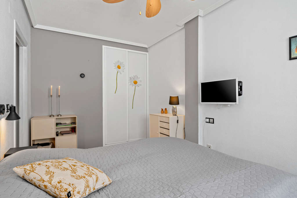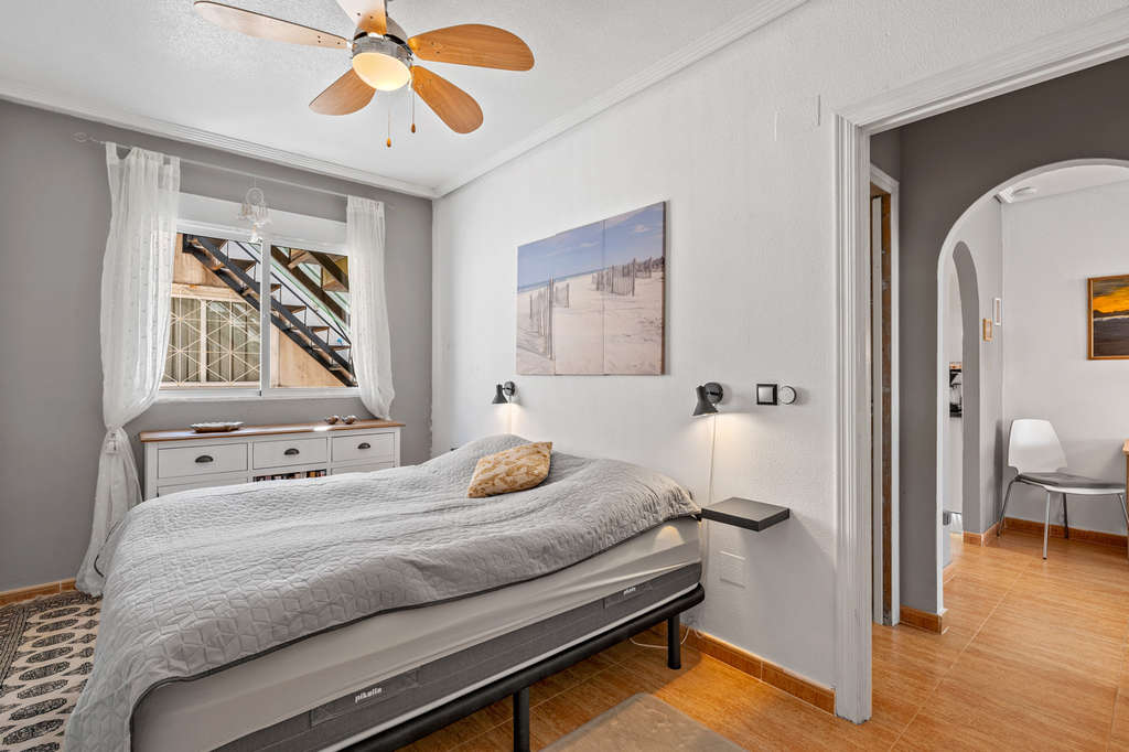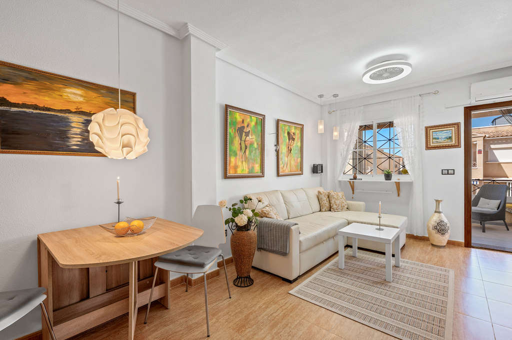 Este apartamento en la última planta, bien mantenido y acogedor, se encuentra en una zona tranquila y atractiva, ofreciendo una combinación perfecta de privacidad, luz natural y proximidad a todos los servicios. El bungalow fue construido en 2003 y ofrece 49 m² de espacio habitable, así como una encantadora terraza privada en la azotea de aproximadamente 25 m², desde donde podrá disfrutar de agradables vistas de los alrededores e incluso vislumbrar el mar en el horizonte. El apartamento es luminoso y está bien distribuido, con una distribución eficiente que aprovecha al máximo el espacio. Le da la bienvenida una encantadora terraza acristalada, que sirve como espacio habitable adicional durante todo el año, perfecta para disfrutar de su café matutino o como un acogedor rincón de lectura. En el interior, encontrará un luminoso y acogedor salón con espacio para comedor y sala de estar. El aire acondicionado con función de frío y calor garantiza el confort durante todo el año. Desde el salón, se accede fácilmente al resto de la casa, que consta de dos dormitorios de buen tamaño, ambos con armarios empotrados y lámparas de techo con ventilador. La cocina ha sido reformada con mucho gusto y cuenta con una moderna y elegante cocina danesa Kvik, que ofrece un nivel de calidad poco común en este tipo de propiedades. Además, se ha instalado un sistema de filtración de agua que proporciona acceso directo a agua potable limpia. Junto a la cocina hay un práctico patio donde se ubican el frigorífico/congelador, la lavadora y el calentador de agua. Desde aquí también se accede a las escaleras que conducen al verdadero atractivo de la propiedad. La terraza de la azotea es un fantástico espacio exterior con amplio espacio para muebles de comedor y de estar. Aquí podrá disfrutar del sol durante todo el día y, gracias al toldo instalado, podrá crear fácilmente sombra durante las horas más calurosas. Es el entorno perfecto para relajarse, hacer barbacoas y disfrutar de veladas acogedoras con familiares y amigos, todo ello mientras se contemplan las vistas de la zona y se vislumbra el mar. El apartamento se vende amueblado y se encuentra en buen estado, listo para que se mude y empiece a disfrutar de la vida en España desde el primer día. La propiedad forma parte de una encantadora comunidad que cuenta con una gran piscina comunitaria con piscina infantil, así como zonas verdes bien cuidadas, ideales para relajarse y socializar. La zona es tranquila y consolidada, a la vez que está cerca de todo lo que necesita. A tan solo unos minutos en coche, encontrará varios supermercados, restaurantes y cafeterías para su comodidad diaria, incluido Aldi, que se encuentra a aproximadamente 1,6 km del apartamento. Además, hay varios buenos restaurantes a aproximadamente 1 km, lo que facilita disfrutar de una buena comida cerca de casa. Las populares playas de la zona también están a poca distancia en coche, donde podrá disfrutar de las cristalinas aguas del Mediterráneo y de amplios paseos marítimos. La famosa playa de La Zenia se encuentra a tan solo 3,8 km del alojamiento. Para los amantes del golf, hay varios campos de golf de renombre en las inmediaciones, y para quienes disfrutan de un estilo de vida activo, el popular Orange Padel Center está a solo 2 km del apartamento. El bulevar Zenia, el centro comercial más grande de la zona con una amplia selección de tiendas, restaurantes y ocio, también está cerca, a tan solo 2,7 km. Además, podrá disfrutar del animado y popular mercado de los sábados en Playa Flamenca, situado a poca distancia del alojamiento. Allí encontrará de todo, desde productos frescos y delicias locales hasta ropa y artesanía: una experiencia maravillosa y un atractivo habitual para muchos residentes de la zona. En definitiva, un alojamiento encantador y listo para entrar a vivir, con una preciosa terraza en la azotea y una ubicación privilegiada cerca de todo lo que la Costa Blanca tiene para ofrecer.
