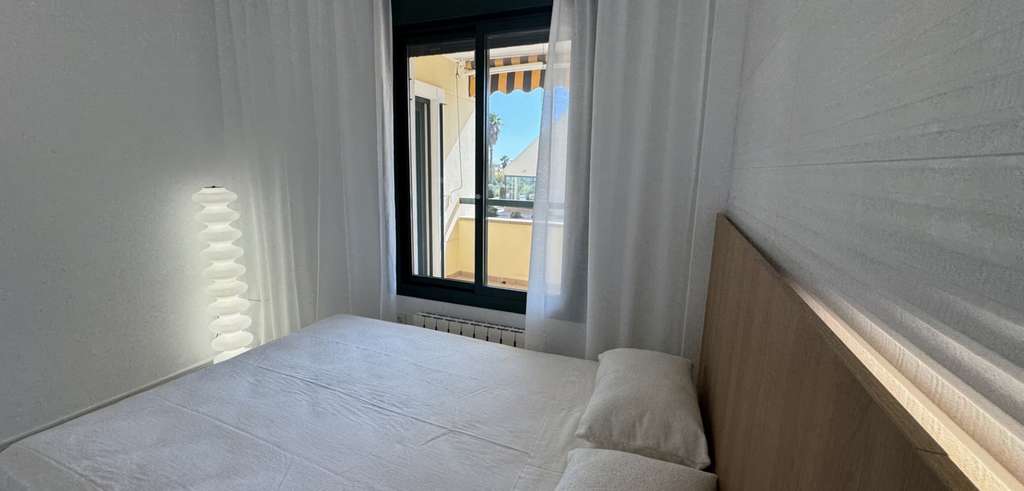 La vivienda cuenta con 83 m² construidos, distribuidos en 2 amplios dormitorios y 2 baños modernos, incluyendo una elegante ducha tipo walk-in. Ha sido totalmente reformada con materiales de alta calidad como suelos porcelánicos de gran formato y elementos de piedra natural. El luminoso salón se complementa con mobiliario de diseño y una cocina moderna totalmente equipada con placa de inducción y electrodomésticos de calidad.