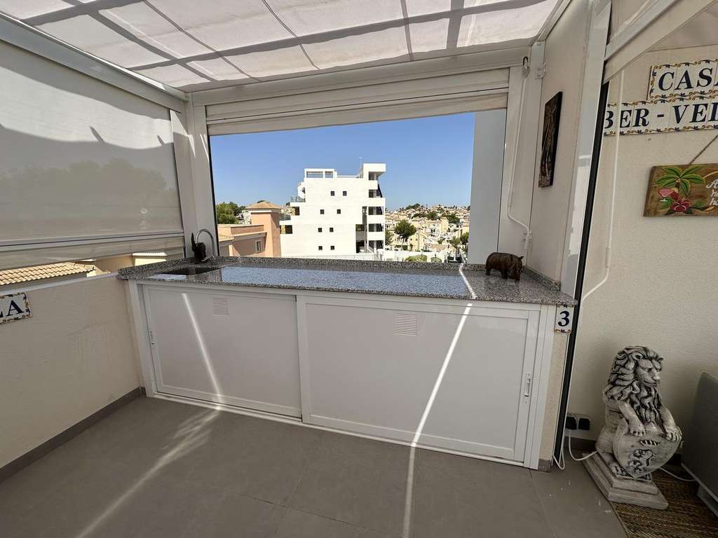 Ático con Vistas al Mar y Jacuzzi Privado en Venta en Orihuela Costa Moderno ático con vistas al mar en venta en Orihuela Costa, situado en el exclusivo residencial VillaCosta III. Vivienda de obra nueva, entregada en enero de 2024, con 160 m² construidos incluyendo solárium privado, vistas panorámicas al mar, excelente privacidad y listo para entrar a vivir. Solárium privado con jacuzzi y vistas al mar, ideal para disfrutar del clima mediterráneo. Equipado con zona de comedor exterior, mobiliario de alta calidad, toldos y gran privacidad. Dispone de 2 dormitorios, 2 baños, cocina totalmente equipada con electrodomésticos Siemens, luminoso salón-comedor y acabados modernos y neutros. Opción de compra totalmente amueblado. Incluye plaza de garaje subterránea, trastero, ascensor y recinto cerrado. A unos 10 minutos de la playa, cerca de comercios, restaurantes, campos de golf y centros comerciales. Ático ideal como vivienda habitual, segunda residencia o inversión.