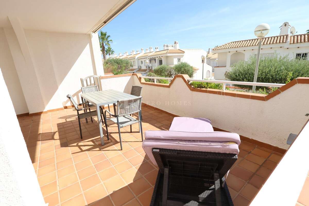 Aguamarina, bungalow planta baja en esquina y orientación sur, vivienda con licencia turistica con una superficie de 75 m2 con 2 dormitorios, baño, amplio salón comedor, cocina independiente con galeria y patio trasero, gran terraza de unos 25 m2, la vivienda se vende amueblada y con aire acondicionado, el residencial cuenta con piscina comunitaria, se encuentra a tan solo 350 m de la playa.~