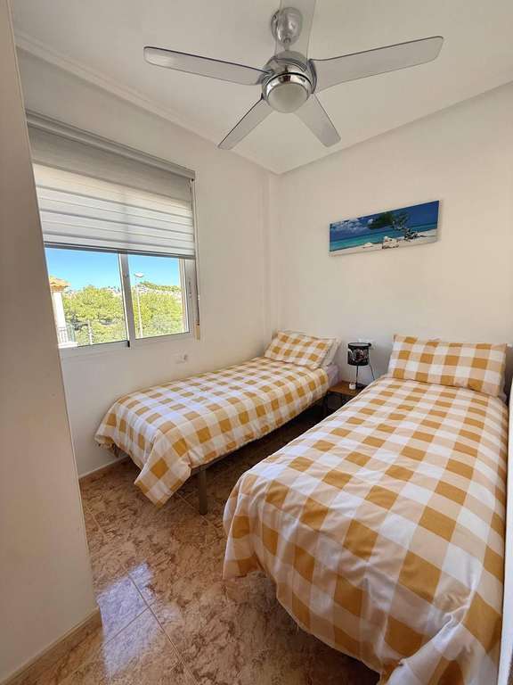 ¡Una opción maravillosa para vivir junto al mar o disfrutar de unas vacaciones relajantes en cualquier época del año! Superficie: 60 m² Planta: 1ª planta (planta española) Solárium privado con ducha y trastero ️ Vistas panorámicas de Orihuela Costa y el mar Distribución: • 2 dormitorios • 1 baño • Salón luminoso con acceso a un balcón soleado • Cocina independiente totalmente equipada Urbanización: Residencial cerrado con zonas verdes bien cuidadas y una gran piscina comunitaria. Aparcamiento privado disponible (1 plaza incluida en el precio). Ubicación: • La playa está a solo 9 minutos en coche • El aeropuerto de Alicante está a unos 40 minutos • Tiendas, restaurantes, cafeterías y campos de golf en las inmediaciones Impuesto sobre Bienes Inmuebles (IBI): 136 € ¡Una maravillosa combinación de confort, naturaleza y el sol español en una prestigiosa zona costera!