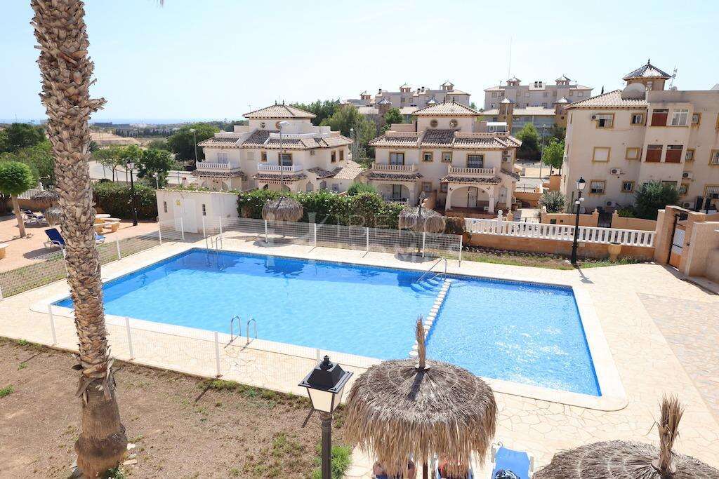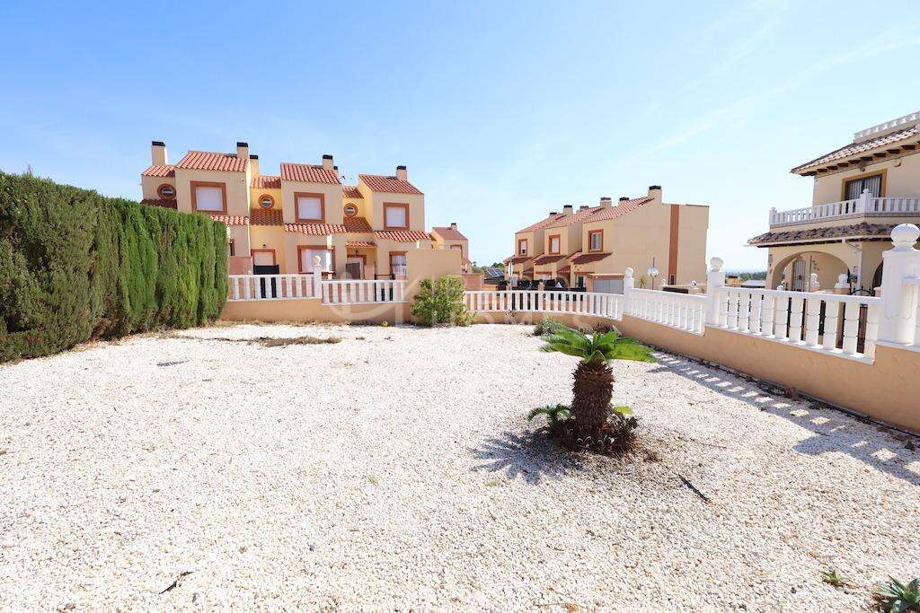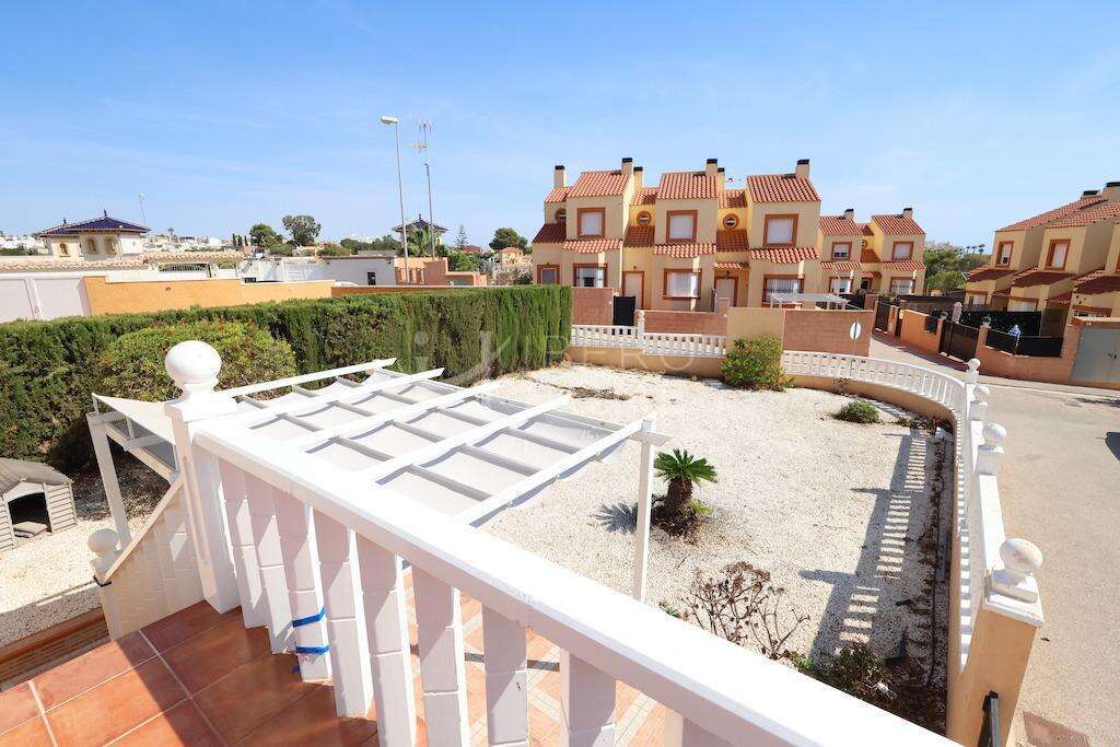 Lomas de Cabo Roig, Adosado en esquina orientación sur con vistas al mar y gran parcela de 130 m2 con posibilidad de construir tu propia piscina, la vivienda se distribuye en 2 plantas mas solarium de 97 m2 construidos, en la planta baja se encuentra una gran terraza de unos 14 m2 cocina americana, baño con ducha y un gran salón comedor, en la planta primera se encuentran los 2 dormitorios el dormitorio principal con su propia terraza con vistas al mar y un baño completo con bañera, y el solarium de unos 18 m2 con vistas al mar, la parcela tiene su entrada para el coche y dispone de un gran trastero, la vivienda dispone de aire acondicionado y se vende amueblada, el residencial cuenta con piscina comunitaria.~