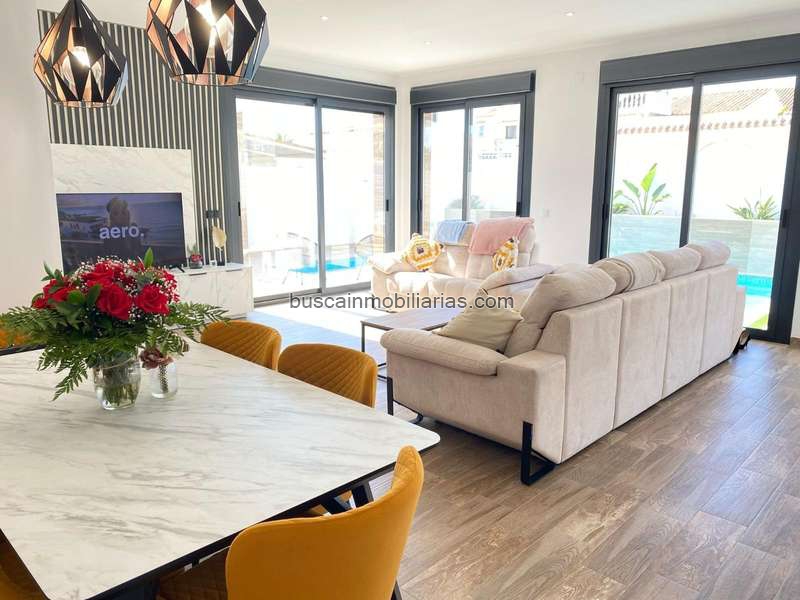 Su interior ha sido minuciosamente reformado utilizando materiales contemporáneos; destaca la carpintería lacada en blanco que añade luminosidad a todos sus espacios. Orientación sur asegura luz natural durante todo el día mientras disfrutas del suelo porcelánico fácil mantenimiento.Cuenta también con piscina privada donde podrás relajarte bajo el sol español y disfrutar momentos inolvidables al aire libre desde su amplia terraza.Esta villa no solo te ofrece confort sino también extras como agua corriente e iluminación adecuada.Diseñada pensando tanto en tu bienestar diario como tus necesidades sociales.Aprovecha esta oportunidad única.