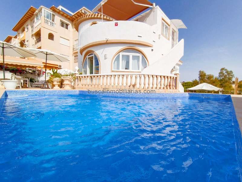 Villa independiente en Playa de la Zenia, Orihuela Costa, con 4 dormitorios, 3 baños, cocina americana, salón con chimenea, todo exterior, piscina privada, porche cerrado con vistas a la piscina, parking para 3 coches, trastero, lavandería, gran solarium en terraza, aire acondicionado, chimenea, cerramientos de PVC con doble cristal,