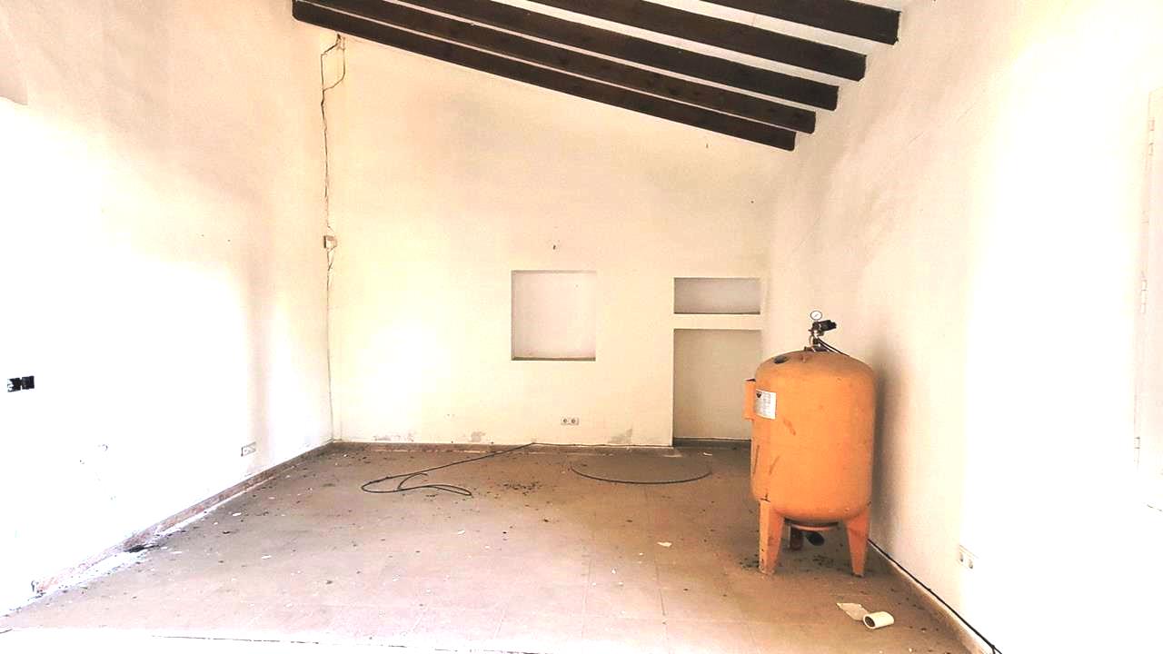 Finca: 2 dormitorios, 1 baño. Salón-comedor de planta abierta, cocina (sin muebles) y patio en la parte delantera. Incluye vigas de madera en el techo para un aspecto rústico.