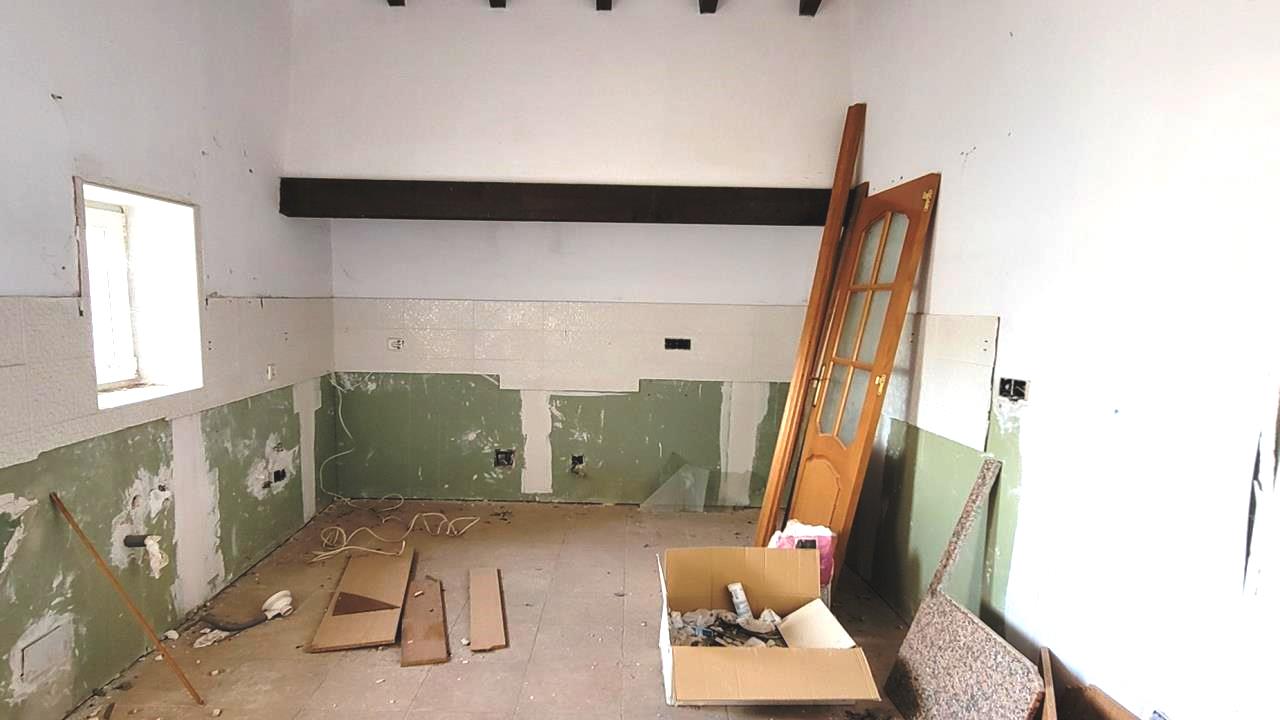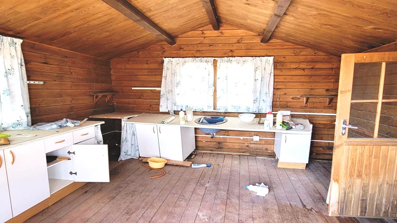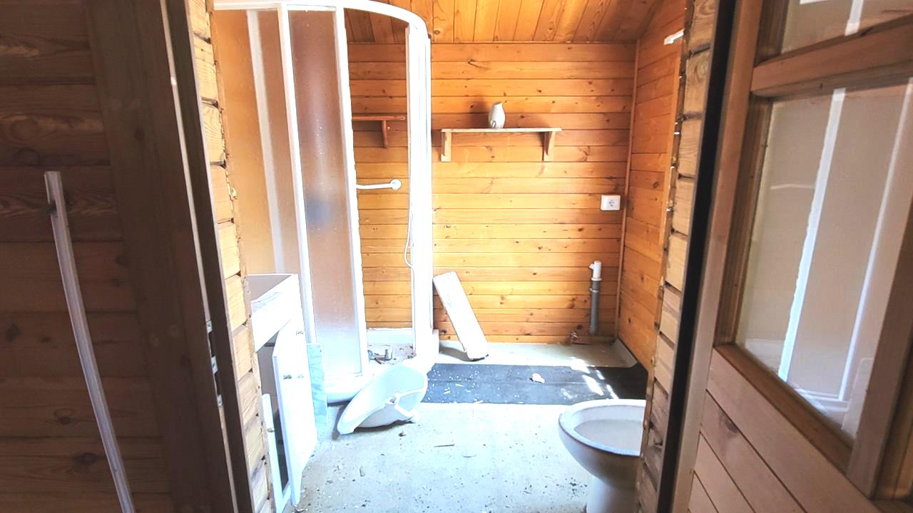 Con una verja en la parte delantera, a su izquierda se encuentran los dos chalets de madera de 111m² y a su derecha la finca de 113m². Ambas propiedades necesitan una renovación completa. Llevan varios años sin habitarse y muestran signos visibles de desgaste, por lo que la finca necesita ser asfaltada.
