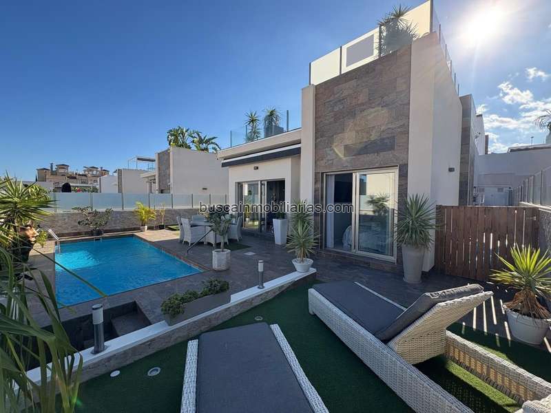 Sal al exterior y descubre tu propia piscina privada - rodeada por una amplia terraza donde podrás tomar el sol ☀️ o disfrutar maravillosos atardeceres desde su enorme solárium equipado con zona bar -. Ubicada en un tranquilo barrio residencial - a solo *10 minutos* de la playa -‍♂️ y cerca del famoso campo golf Villamartín ⛳; no te faltará nada: tiendas, supermercados -‍♀️y restaurantes están a tan solo *1 km*. ¡Esta propiedad es perfecta como residencia permanente o casa vacacional! No pierdas esta oportunidad única ✨.