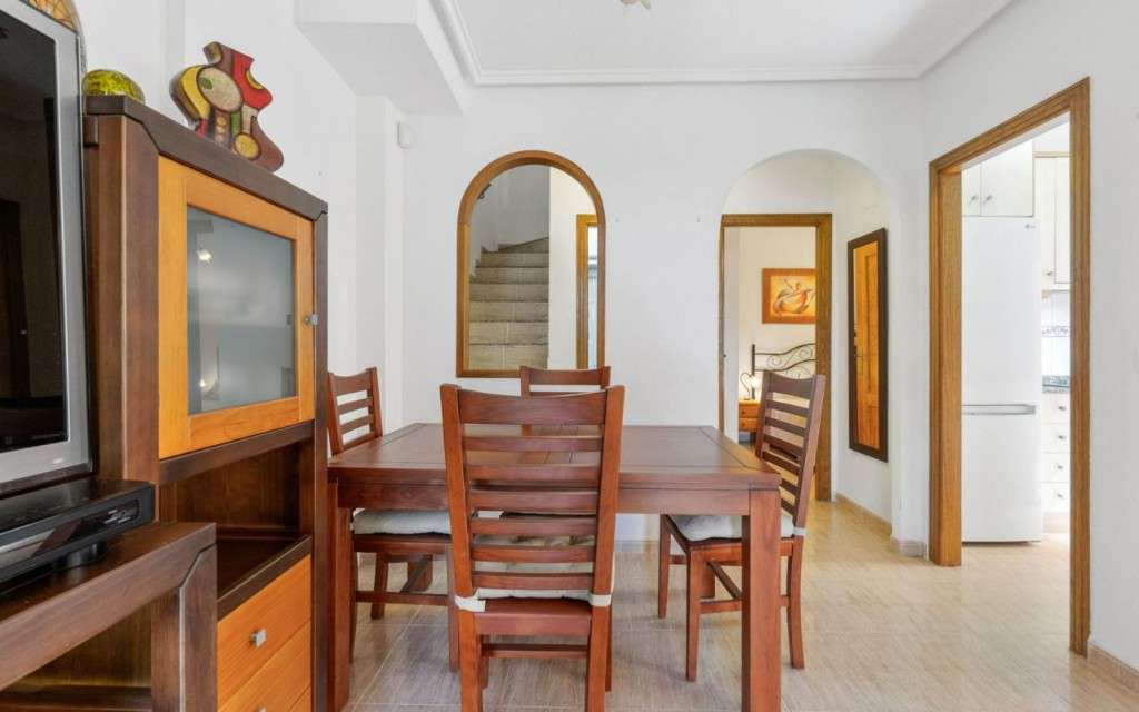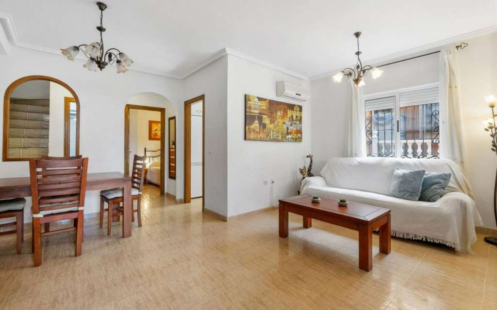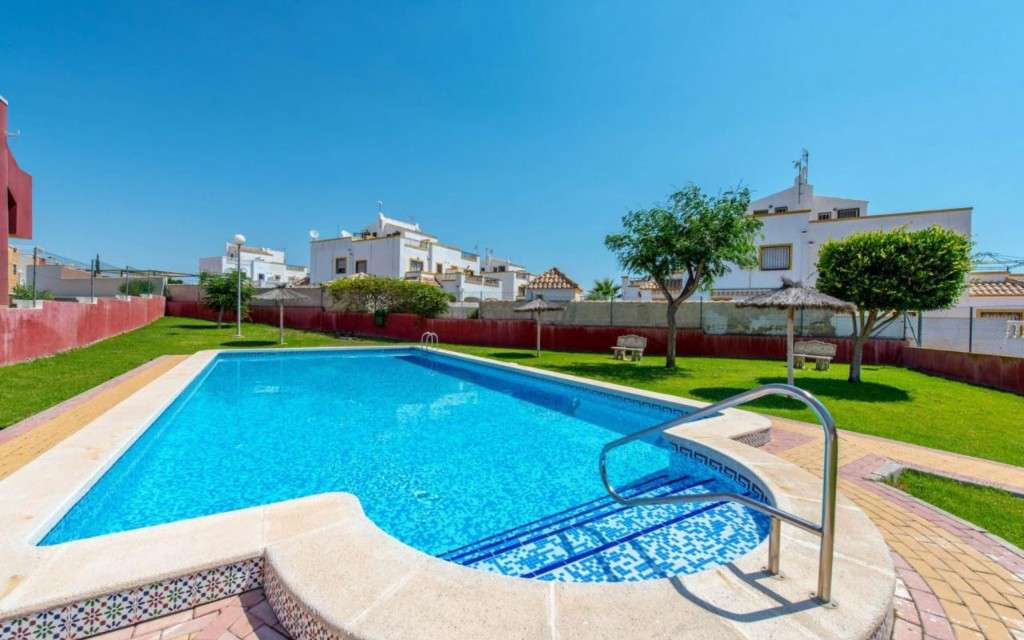 Nos complace presentar esta acogedora y espaciosa casa adosada (tipo quad) en Dream Hills II, una zona bien establecida y popular en Los Altos, perfecta para quienes buscan una casa de vacaciones al sol o un hogar cómodo para vivir todo el año.La vivienda tiene una distribución bien pensada y cuenta con tres plantas, donde la tercera es un generoso solarium y ofrece tanto comodidad como mucho espacio:Planta baja: Gran jardín embaldosado con pérgola, salón-comedor luminoso y acogedor, cocina independiente con buen espacio de almacenamiento, un dormitorio y un baño.Primera planta: Dos dormitorios y un baño. El dormitorio principal tiene salida a una terraza privada con vistas despejadas.Segunda planta: Solárium privado, perfecto para días soleados, barbacoas y agradables veladas.Amplio jardín embaldosado orientado al sur con pérgola, con espacio más que suficiente para una mesa de comedor, tumbonas o una zona de estar agradable — aquí se puede disfrutar de la vida al aire libre durante todo el día y la noche. Además, hay un trastero grande con mucho espacio de almacenamiento.Las zonas comunes incluyen una bonita piscina con áreas verdes para relajarse y socializar.La ubicación también es una gran ventaja — en un entorno tranquilo, pero a poca distancia a pie de tiendas, restaurantes, farmacia y transporte público. Muy cerca del centro de Torrevieja y de las hermosas playas de Orihuela Costa.Esta es una vivienda con mucho encanto y mucho espacio exterior — para tomar el sol, disfrutar de la vida social o relajarse en paz.