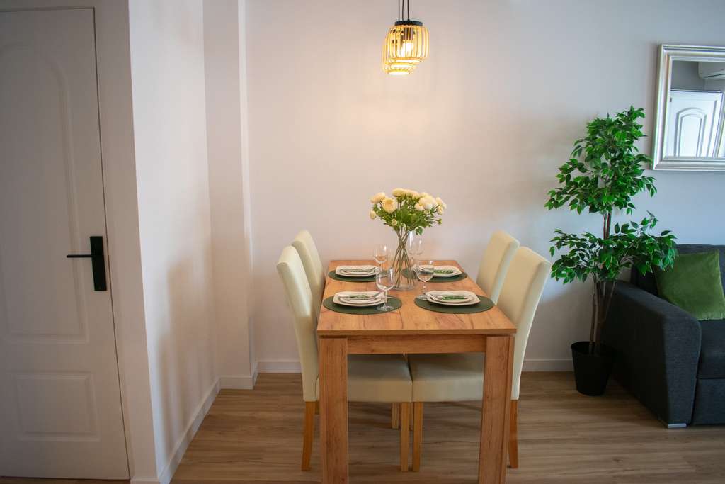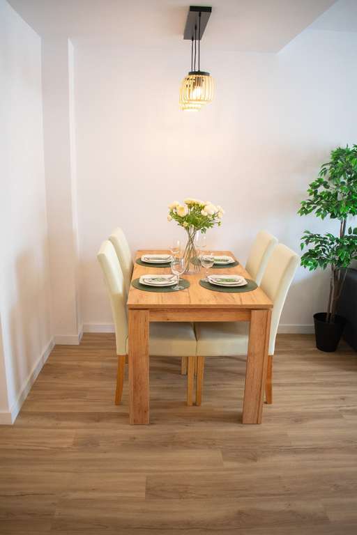 Con tres dormitorios (dos en la planta alta y uno en la planta baja) y dos baños, esta casa adosada ofrece espacios funcionales y bien organizados. En la planta baja se encuentra un amplio y cómodo salón con sofá cama, aire acondicionado y una gran mesa de comedor. La moderna cocina está totalmente equipada con electrodomésticos nuevos y amplios armarios. También hay un dormitorio doble, un baño con ducha moderna, un lavadero y un trastero.