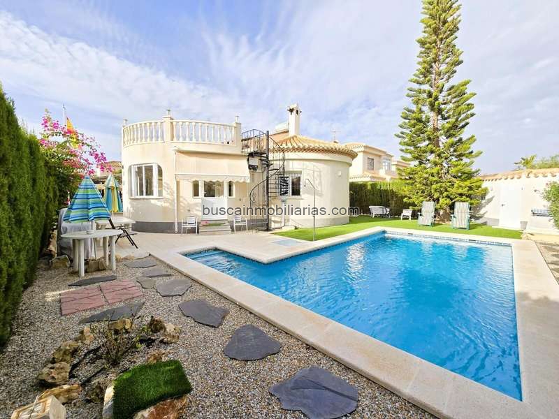✨ ¡Tu nuevo hogar a tan solo 1 km del mar te está esperando! Este magnífico chalet independiente de 150 m2 combina diseño moderno, confort y eficiencia energética en cada rincón. En la planta principal encontrarás un gran salón con chimenea -, perfecto para reuniones familiares o noches acogedoras, además de una cocina amplia y totalmente equipada con acceso directo a lavadero-almacén y salida al jardín -. La vivienda dispone de 3 dormitorios luminosos con armarios empotrados, y 2 baños completos con acabados de calidad, todos climatizados con aire acondicionado y suelo radiante eléctrico para mantener la temperatura ideal en cualquier estación. La parcela privada de 500 m2 ofrece múltiples espacios: una piscina climatizada de 4x8 m -♂️ rodeada de zona de descanso con césped artificial y terraza, dos trasteros auxiliares ideales para bicicletas, herramientas o mobiliario de temporada, y un porche cubierto donde disfrutar de comidas al aire libre. La vivienda está pensada para la máxima eficiencia y ahorro energético gracias a sus 24 paneles solares, que permiten reducir la factura eléctrica a menos de 10 € al mes, con contrato especial con Iberdrola ⚡. Además, dispone de instalación de gas, fibra óptica de alta velocidad, electricidad trifásica, y dos antenas parabólicas para una conectividad perfecta -. El sótano-bodega de 25 m2 es un espacio versátil que puede usarse para almacenar vinos, como gimnasio, despacho privado o sala de ocio -. El sistema de riego automático mantiene en perfecto estado los árboles frutales y plantas ornamentales -, mientras que la iluminación exterior con sensores de movimiento aporta seguridad y practicidad. La casa cuenta también con plaza de aparcamiento para dos vehículos --, portón automático de entrada y pavimento antideslizante en exteriores. Ubicada en una zona residencial tranquila pero bien comunicada, se encuentra a escasos minutos de supermercados, colegios, farmacias, restaurantes, zonas deportivas y el centro comercial La Zenia Boulevard -️. Además, su proximidad a playas de arena fina convierte esta propiedad en una opción ideal tanto para residencia habitual como para casa vacacional o inversión. - Una vivienda que lo tiene todo: espacio, comodidad, tecnología, sostenibilidad y una ubicación privilegiada junto al mar. ¡No dejes pasar esta oportunidad!