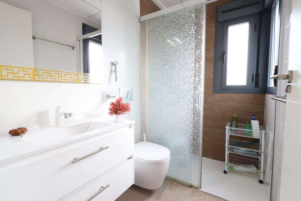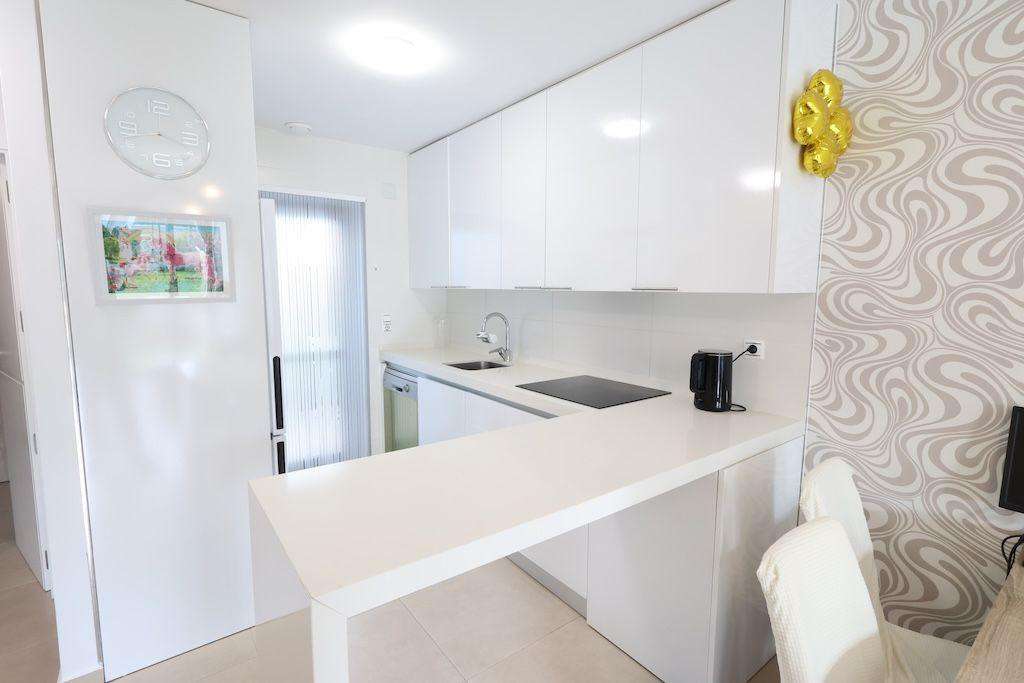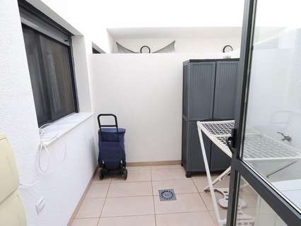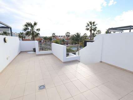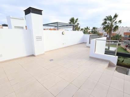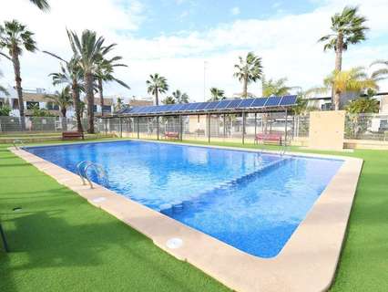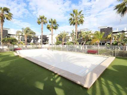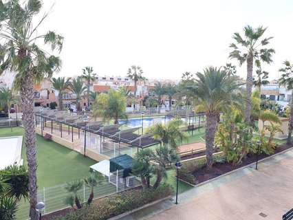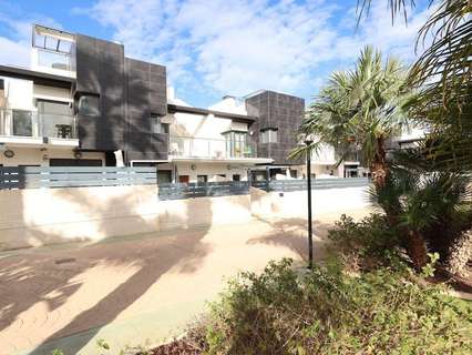 Playa Flamenca, Residencial El manantial adosado con orientación sur de dos plantas más sótano destinado a garaje de 101 m2 y 97 m2 de garaje, la vivienda cuenta con 3 dormitorios (1 de ellos en planta baja) y 3 baños, salón comedor, cocina abierta al salóncon patio trasero, amplio jardin delantero frente a la zona comunitaria y un amplio solarium con vistas a las zonas comunes y a las 2 piscinas comunitarias y zona de juegos para niños.