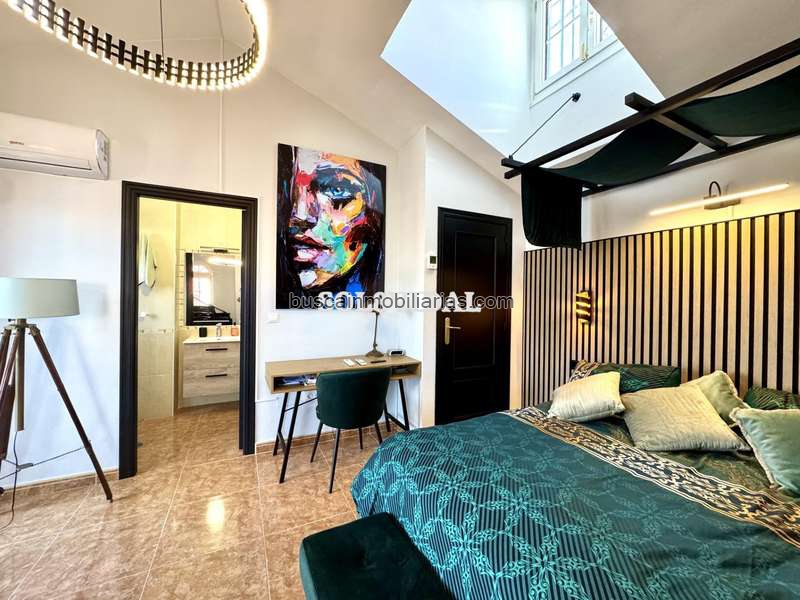 La planta primera dispone de un dormitorio principal con baño en suite y acceso a un balcón exterior, ideal como zona privada de relax.