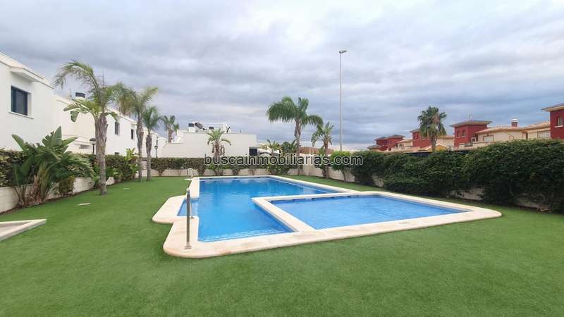 Chalet pareado en Lomas de Cabo Roig, con 100 m2 construidos, 98 m2 metros de parcela, 3 dormitorios, 2 baños, 1 garaje/s, buen estado, exterior, 30 m2 de terraza, cocina amueblada, trastero, amueblado, orientación suroeste, 2016, piscina comunitaria, aire acondicionado frío/calor, acepta animales, suelo de porcelánico