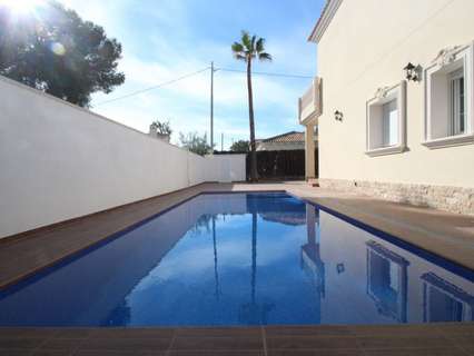 Cabo Roig, Chalet independiente a nuevo estrenar con 520 mts de parcela y una vivienda en 2 alturas más solarium de 220 mts, 4 dormitorios de los cuales 1 están en planta baja y 3 tienen su cuarto de baño incluido y con terraza, 4 baños todos con suelo radiante y 1 aseo, amplio salón con chimenea, cocina semi-independiente equipada, piscina privada (9x4), aire acondicionado, a 300 mts de la playa..