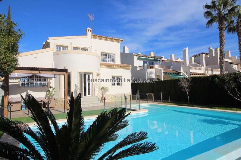 Al ingresar a la villa, lo recibirá una acogedora sala de estar y comedor que fluye a la perfección hacia una cocina de planta abierta. Grandes ventanales enmarcan la vista de la resplandeciente piscina, creando un ambiente luminoso y aireado. La planta baja también cuenta con dos dormitorios bien equipados, un baño elegante y moderno y un lavadero práctico, que brinda comodidad y funcionalidad con mucho espacio de almacenamiento.