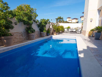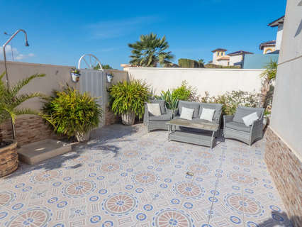 Ubicada en la parte superior de un tranquilo callejón sin salida en Playa Flamenca, esta impresionante villa independiente orientada al sur con piscina privada ofrece un generoso espacio habitable distribuido en tres plantas, donde tiene hermosas vistas desde el jardín trasero y la terraza de la azotea.