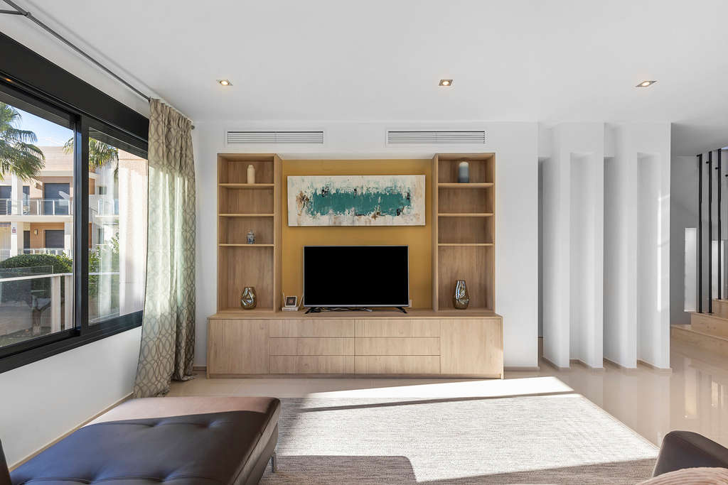Esta villa está situada en un residencial exclusivo y tiene su propia piscina privada y una parcela de 410m2. La vivienda cuenta con 250m2 construidos divididos en 4 plantas. En planta baja encontramos un amplio salón con cocina americana, 1 dormitorio, 1 baño y terraza con con salida a la piscina. En planta semi-sótano encontramos un salón con cocina americana, 2 dormitorios y 1 baño. Además esta planta cuenta con sauna y ducha. En planta primera encontramos 2 dormitorios, cada uno tiene uno baño en-suite y una amplia terraza. En la planta superior hay un amplio solarium de 46m2.
