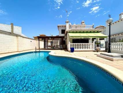 Chalet independiente, ubicado en una de las más populares zonas de Orihuela Costa, la Zenia, solamente a 400m de la playa. Construida sobre la parcela de 453m2, la vivienda de dos plantas tiene unos 150m2 de superficie. En la planta baja encontramos un amplio y luminoso salón comedor con chimenea, cocina semi- independiente, 2 dormitorios dobles y 1 baño y lavadero. Espacioso porche delantero. En la planta primera están ubicados otros dos dormitorios y otro baño. Del dormitorio principal hay una salida a la terraza de unos 20m2. La vivienda está orientada al sur. Piscina privada de 28m2, con agua salada. En la planta sótano está el garaje cerrado. Se vende amueblada. Cerca de todos los servicios necesarios, gran variedad de bares y restaurantes, sitio ideal para vivir todo el año o pasar unas magnificas vacaciones. La Playa de La Zenia está a menos de 10 minutos andando a la playa. El CC La Zenia Boulevard está en 5 minutos en el coche.