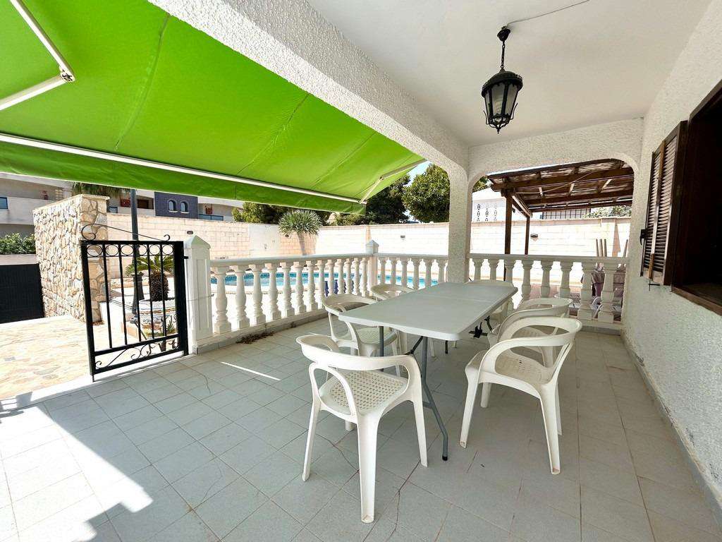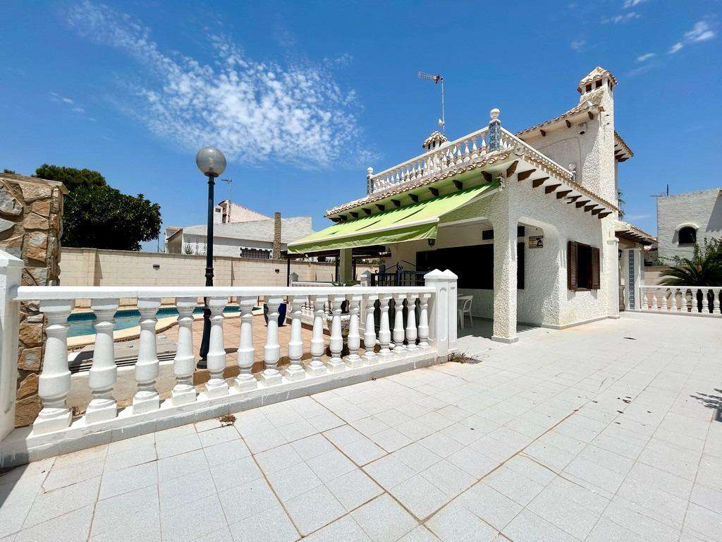 Chalet independiente, ubicado en una de las más populares zonas de Orihuela Costa, la Zenia, solamente a 400m de la playa. Construida sobre la parcela de 453m2, la vivienda de dos plantas tiene unos 150m2 de superficie. En la planta baja encontramos un amplio y luminoso salón comedor con chimenea, cocina semi- independiente, 2 dormitorios dobles y 1 baño y lavadero. Espacioso porche delantero. En la planta primera están ubicados otros dos dormitorios y otro baño. Del dormitorio principal hay una salida a la terraza de unos 20m2. La vivienda está orientada al sur. Piscina privada de 28m2, con agua salada. En la planta sótano está el garaje cerrado. Se vende amueblada. Cerca de todos los servicios necesarios, gran variedad de bares y restaurantes, sitio ideal para vivir todo el año o pasar unas magnificas vacaciones. La Playa de La Zenia está a menos de 10 minutos andando a la playa. El CC La Zenia Boulevard está en 5 minutos en el coche.