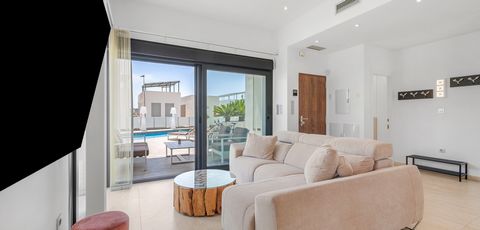 La villa cuenta con tres amplios dormitorios, todos ellos con armarios empotrados, y dos baños completos, uno de ellos en suite dentro del dormitorio principal. La cocina, de estilo abierto, se integra perfectamente con el comedor y el salón, creando una zona de día luminosa y acogedora, con acceso directo a la terraza y la piscina. También dispone de un práctico cuarto de lavandería independiente.