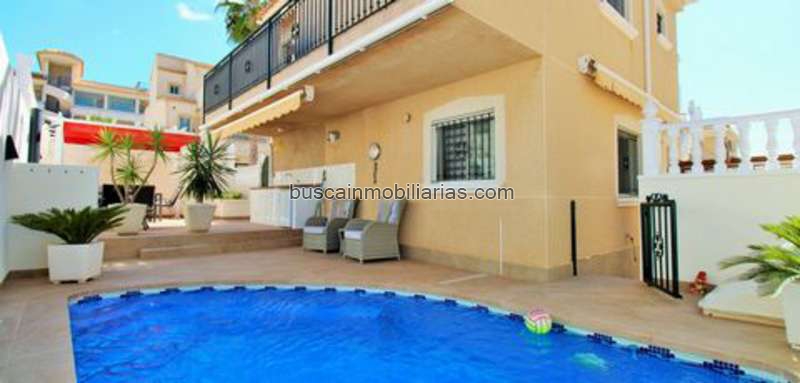 Villa Tialta es una magnífica vivienda independiente situada en la deseada urbanización Montegolf de Villamartin. Cuidadosamente mantenida y con amplios espacios distribuidos en dos niveles independientes, es ideal para familias numerosas, estancias prolongadas o inversión de alquiler. La planta principal ofrece un luminoso salón-comedor, cocina totalmente equipada, dos dormitorios dobles y dos baños modernos. Desde el salón se accede a la terraza privada con pérgola, perfecta para las noches mediterráneas. Un balcón acristalado, tipo invernadero, amplía la zona de estar y ofrece un espacio acogedor durante todo el año.La planta baja cuenta con un apartamento independiente con salón, comedor, segunda cocina, dos dormitorios dobles y un amplio baño familiar, con acceso directo al jardín.El exterior ofrece piscina privada, zona chill-out y cocina de verano totalmente equipada. Hay garaje y aparcamiento para dos coches.Se vende parcialmente amueblada, con aire acondicionado frío-calor, ventiladores de techo y preinstalación de calefacción y paneles solares.A poca distancia del Villamartin Plaza, playas a solo 4 km y cerca del campo de golf de Villamartin.